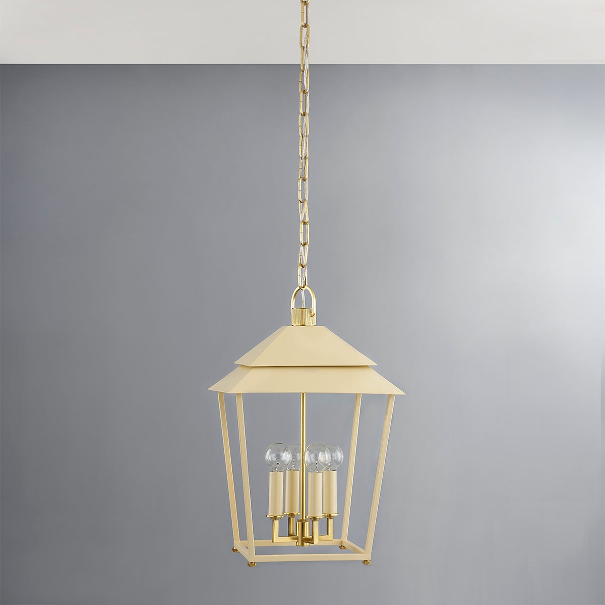 Natick is clean, open, and airy. The double roofline stands out from a traditional lantern, while the Aged Brass metal feet and squared arms add to the unique quality of the piece.