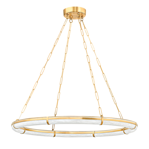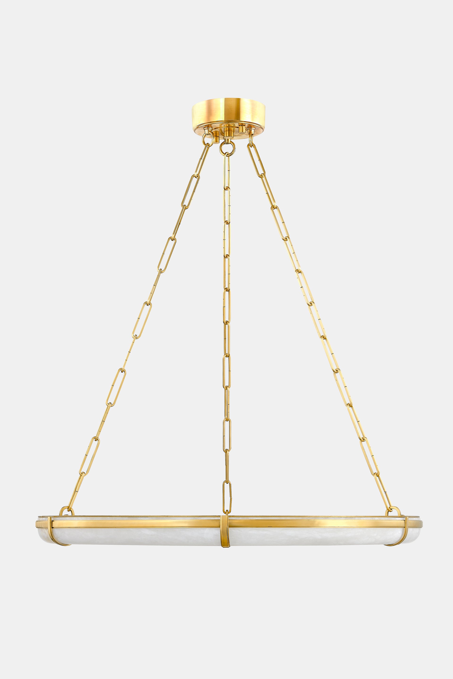 With a large ring-like silhouette, Sennett celebrates the natural beauty of alabaster. The concealed LED emanates a gentle, cozy glow, accentuating the ethereal essence and unique veining of this natural stone. Available in two sizes, Sennett is finished with a sleek Aged Brass framework that lends a modern elegance to interiors.