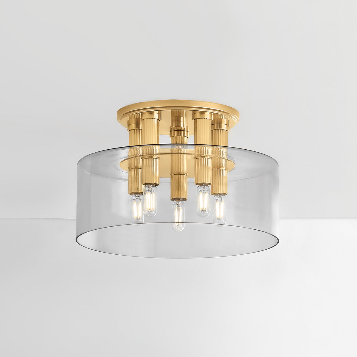 Leaning into the visually tailored sensibilities, the Crystler flush mount features sleek geometries and sophisticated materials. A cluster of elongated socket cups in an Aged Brass finish pierces through a smoke glass shade to create a striking, stylish statement. Whether you opt for 3 or 5 lights, the density of the circular cluster packs a large punch of light into a small amount of space.