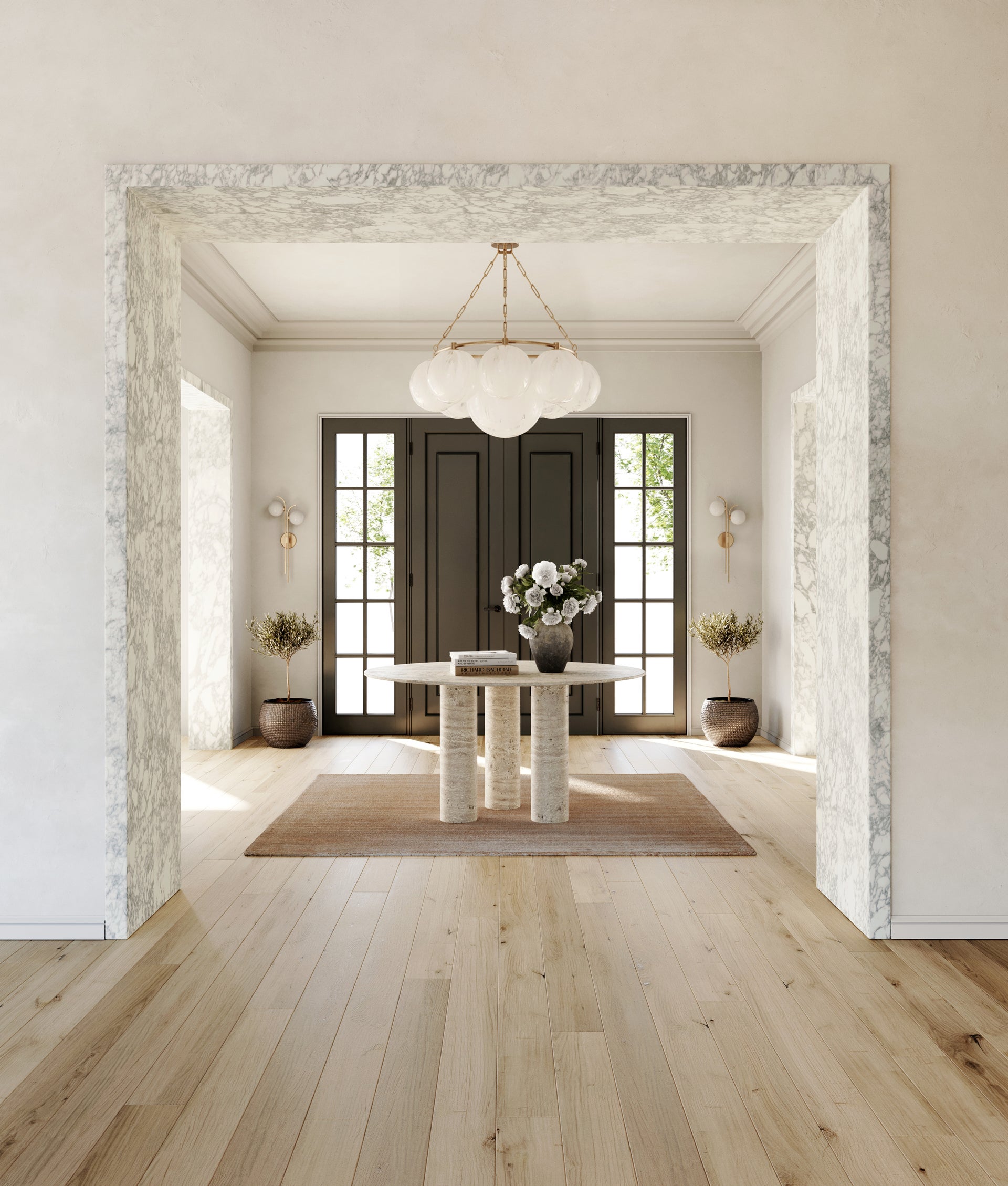 Make a statement on the ceiling with this gorgeous chandelier. Cloud glass globes are arrayed around a larger glass globe at the center creating a silhouette that is stunning whether viewed from across the room or directly underneath. The cloud glass has a wispy, natural feel and the Aged Brass framework and chain detailing add more warmth to this light and airy showstopper.