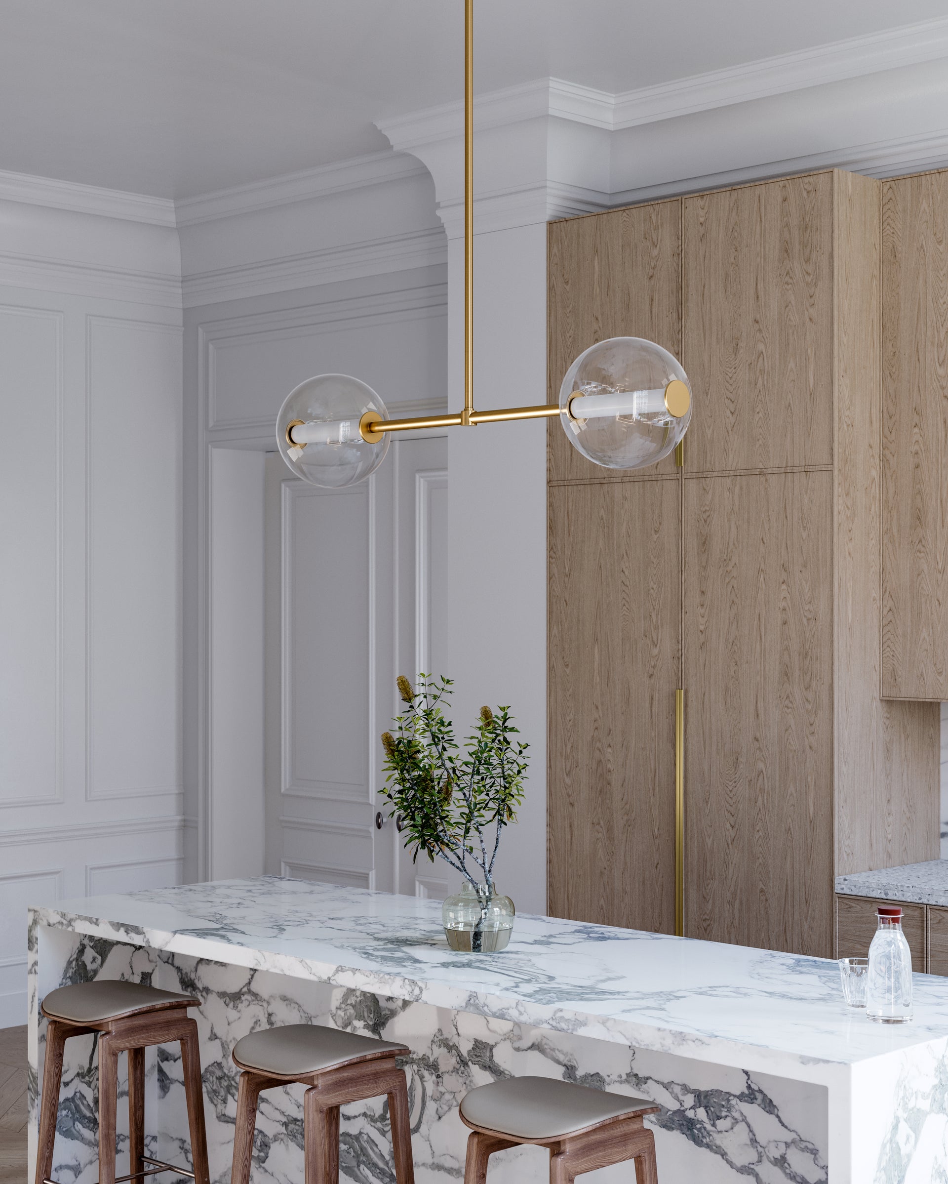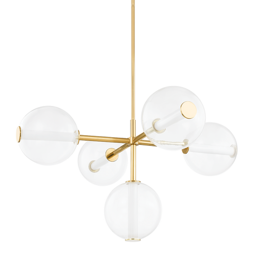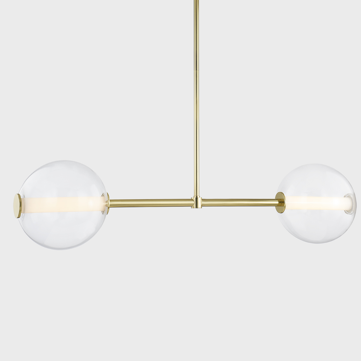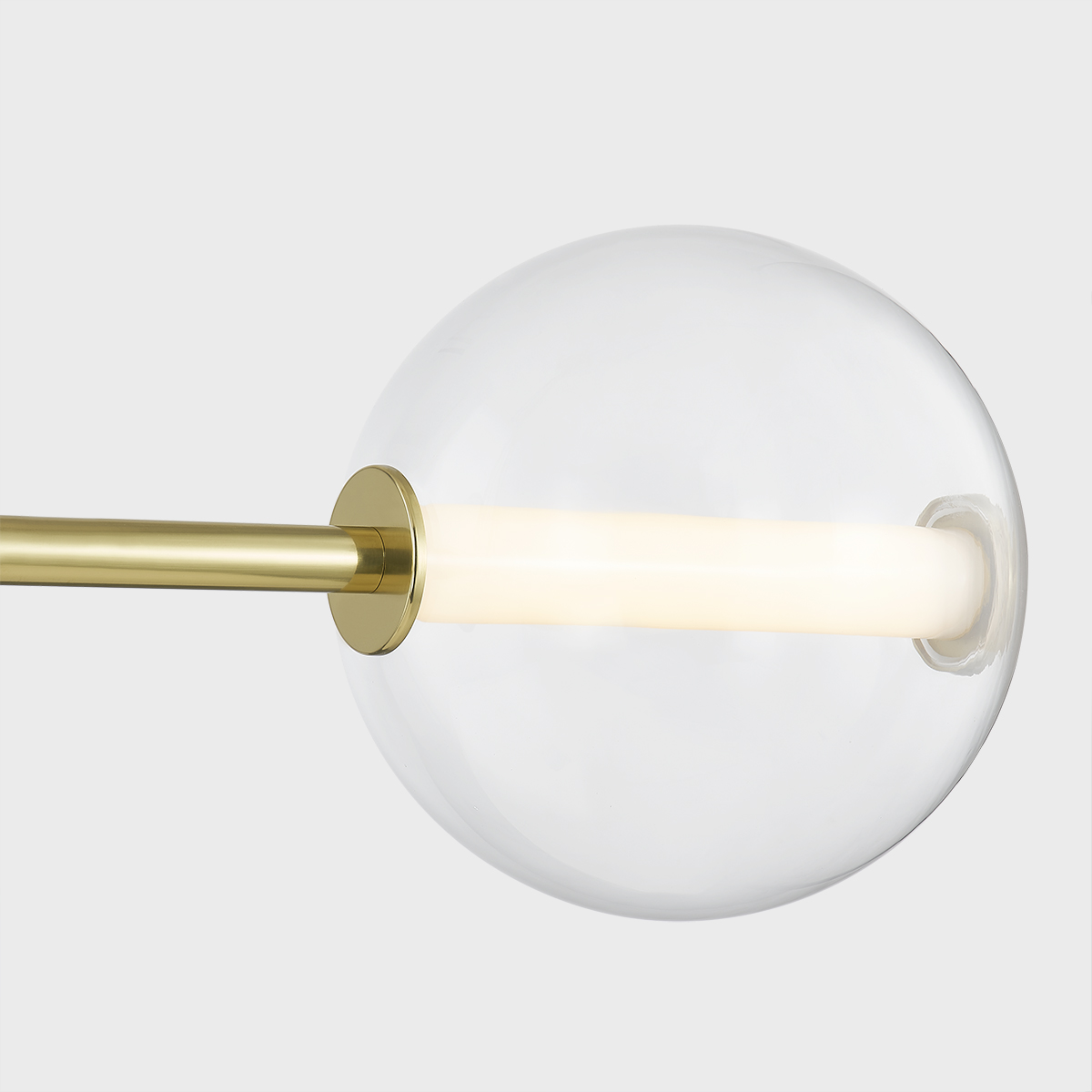 Opal glass LED tube lights are centered within clear glass globes giving Richford a clean, modern silhouette that feels fresh. The lighting effect caused by this innovative glass technique is simply stunning. Available as a sconce, chandelier and linear with Aged Brass arms and details to work in a variety of spaces.