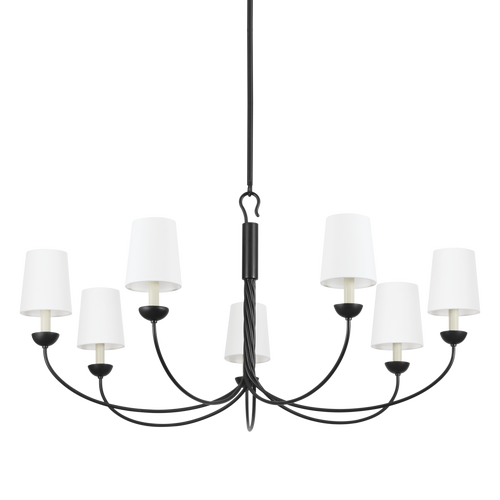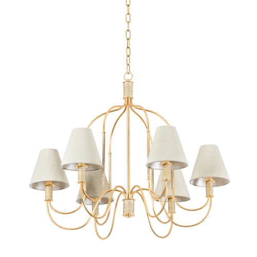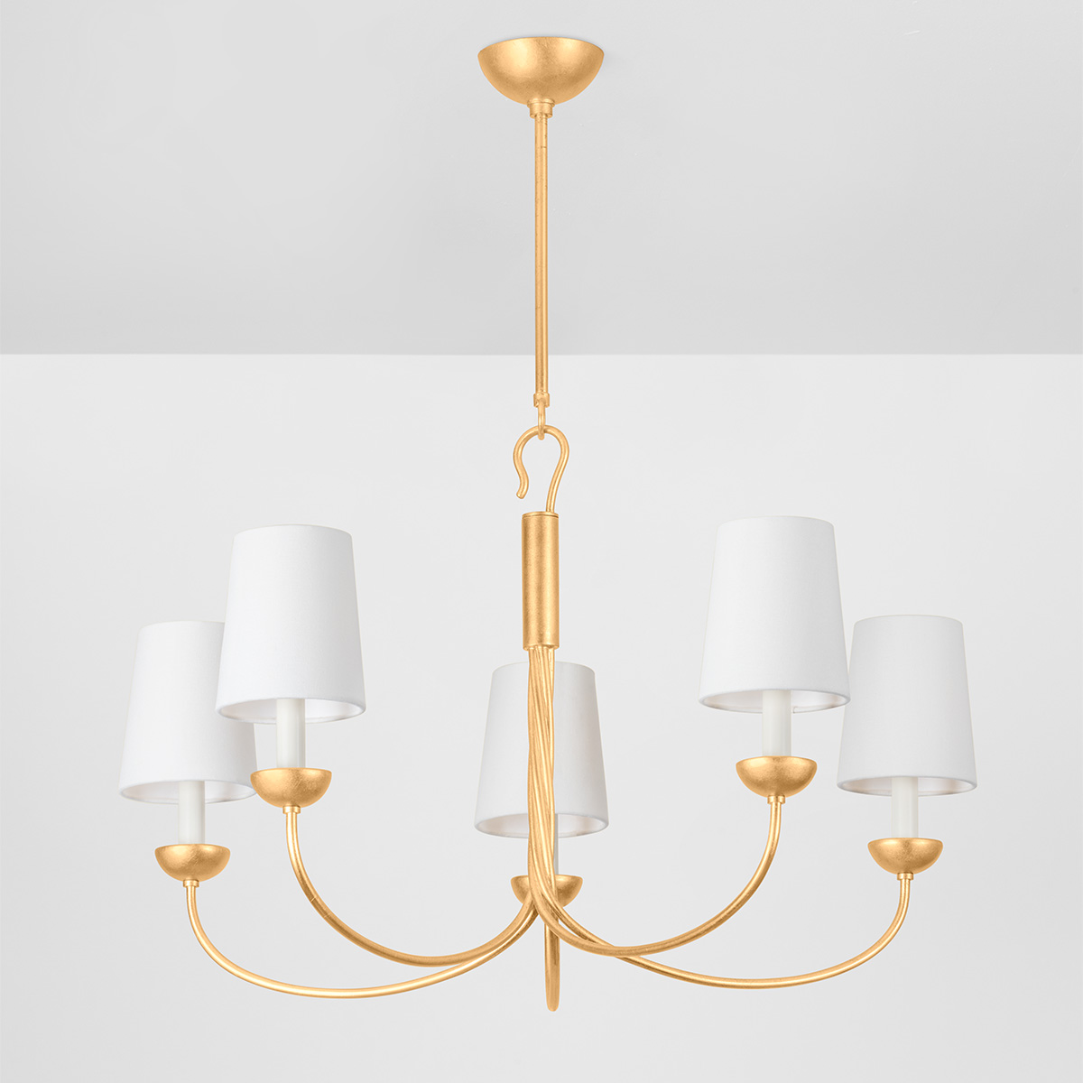 Stylish in its simplicity, the Montpelier chandelier features 5 or 7-candle sleeves topped with tapered white linen shades. A twisted central rod and distinctive hook-and-ring detail offer graceful support to the curved arms of this timeless silhouette. Available in two sizes with a Vintage Gold Leaf or Aged Iron finish, it is an elegant statement piece for a dining room or large gathering space.