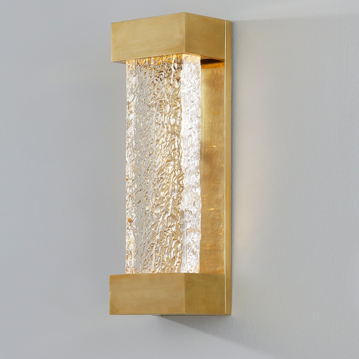 A thick piastra glass diffuser softens the sharp-edged modern metalwork of this streamlined contemporary wall sconce. The textured glass gives the illusion of a waterfall, creating a soothing sense of movement. Light spills from the top of the piece and creates beautiful refraction as it spills down the inside of the glass.