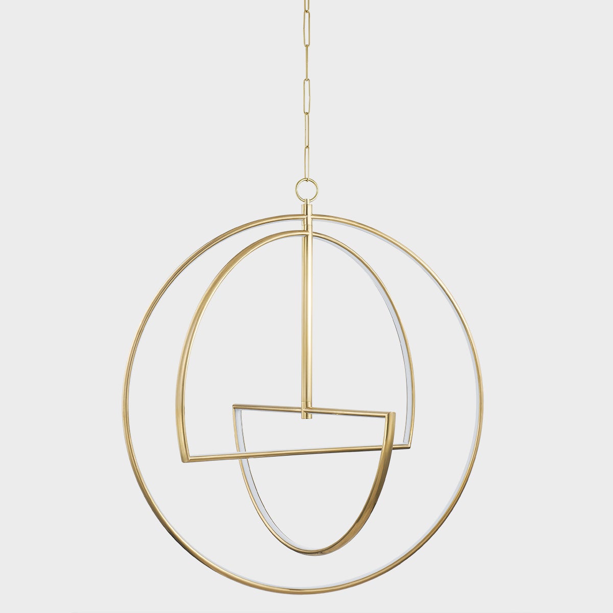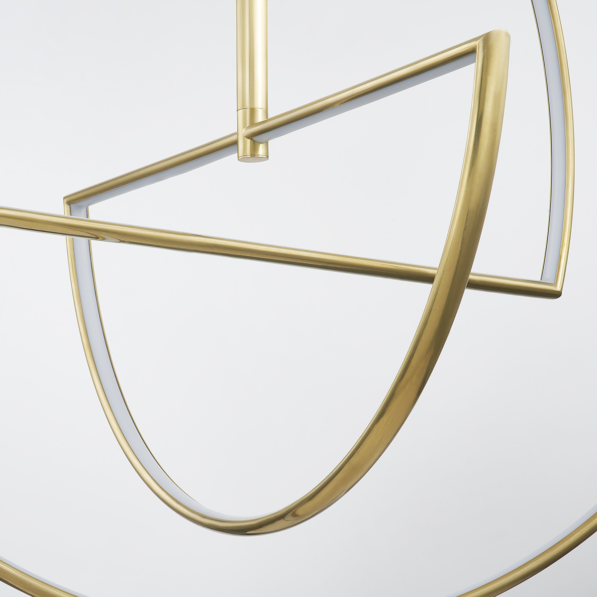 A series of open geometric LED shapes are thoughtfully layered to create an airy, sculptural silhouette. The smooth lines, Aged Brass finish and dynamic design of this stunning chandelier will bring a modern, tailored aesthetic to entryways, dining rooms and other ceilings throughout the home.