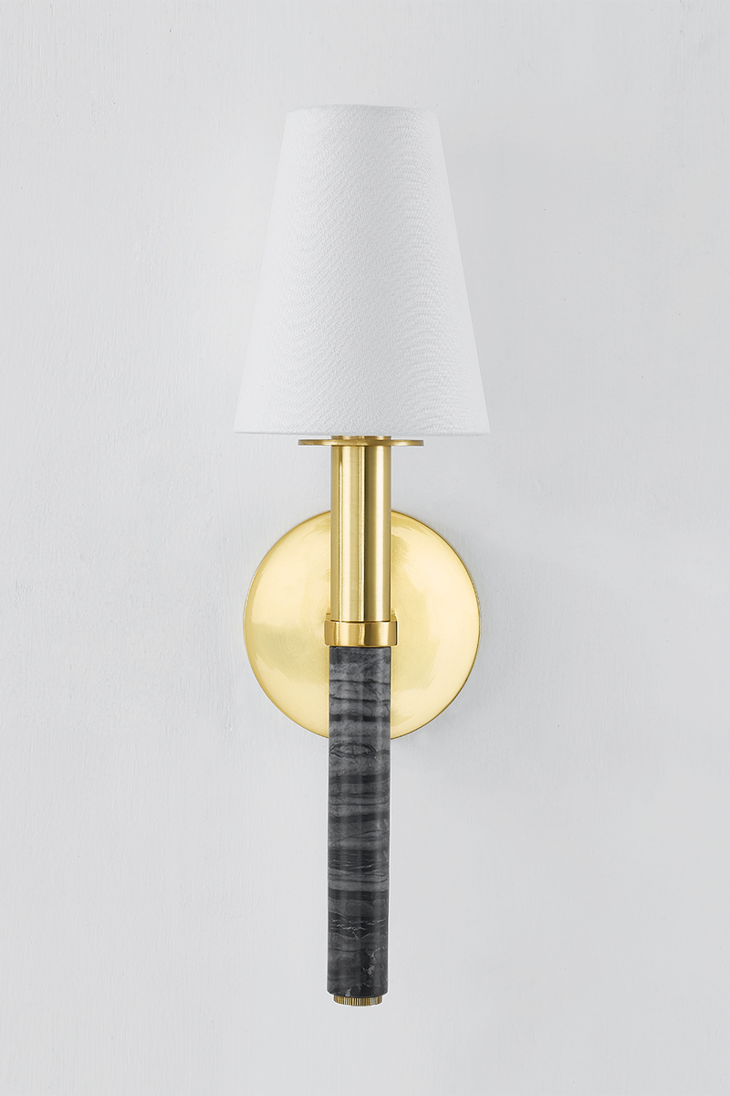 Merging past and present, Montreal features contemporary clean lines and the striking appeal of Nero Modera marble. Each natural stone candle sleeve is topped with a tapered white linen shade and complemented by a warm Aged Brass finish. Available as a sconce or chandelier in two sizes, Montreal embodies understated luxury.