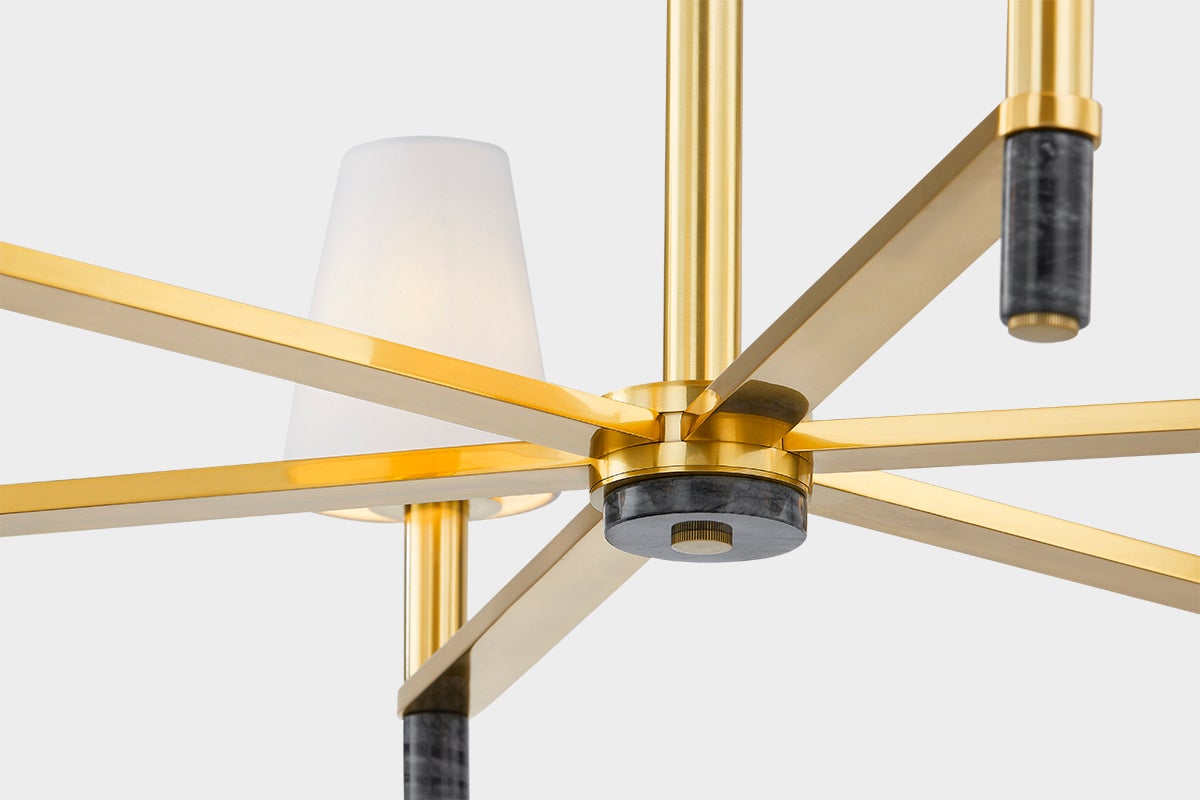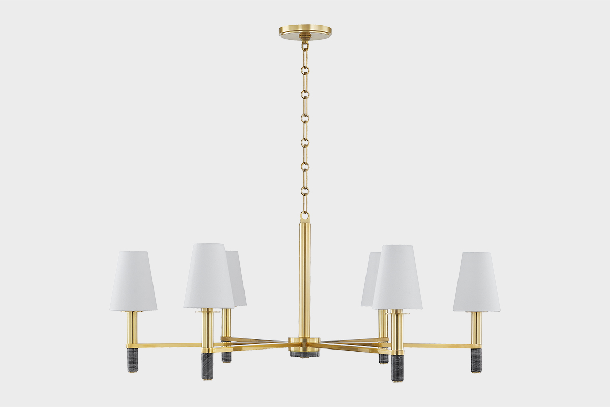 Merging past and present, Montreal features contemporary clean lines and the striking appeal of Nero Modera marble. Each natural stone candle sleeve is topped with a tapered white linen shade and complemented by a warm Aged Brass finish. Available as a sconce or chandelier in two sizes, Montreal embodies understated luxury.