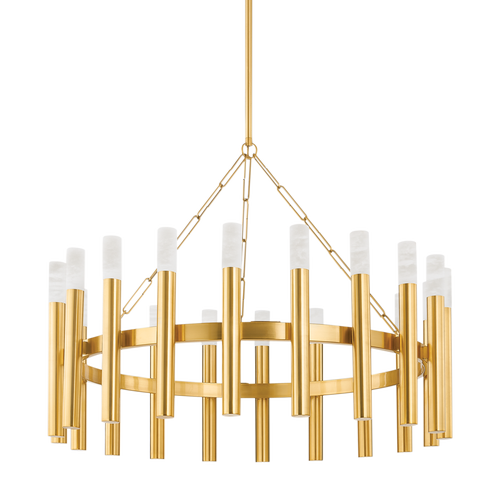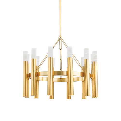 A modern take on a candelabra chandelier, Pali harnesses clean line symmetry to strike a note of grandeur. Available as a sconce or chandelier in two sizes, it features candle sleeves cast from Aged Brass, capped by natural alabaster. When lit, the alabaster emits a reverential glow that fills the room.