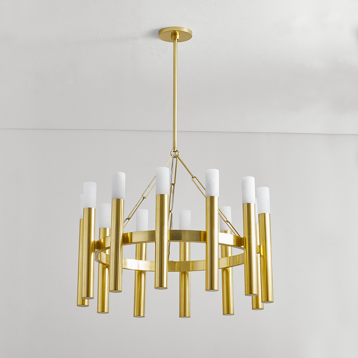A modern take on a candelabra chandelier, Pali harnesses clean line symmetry to strike a note of grandeur. Available as a sconce or chandelier in two sizes, it features candle sleeves cast from Aged Brass, capped by natural alabaster. When lit, the alabaster emits a reverential glow that fills the room.