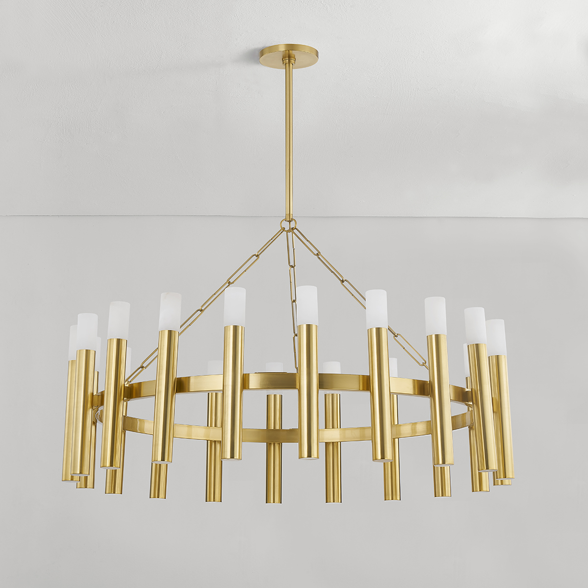 A modern take on a candelabra chandelier, Pali harnesses clean line symmetry to strike a note of grandeur. Available as a sconce or chandelier in two sizes, it features candle sleeves cast from Aged Brass, capped by natural alabaster. When lit, the alabaster emits a reverential glow that fills the room.