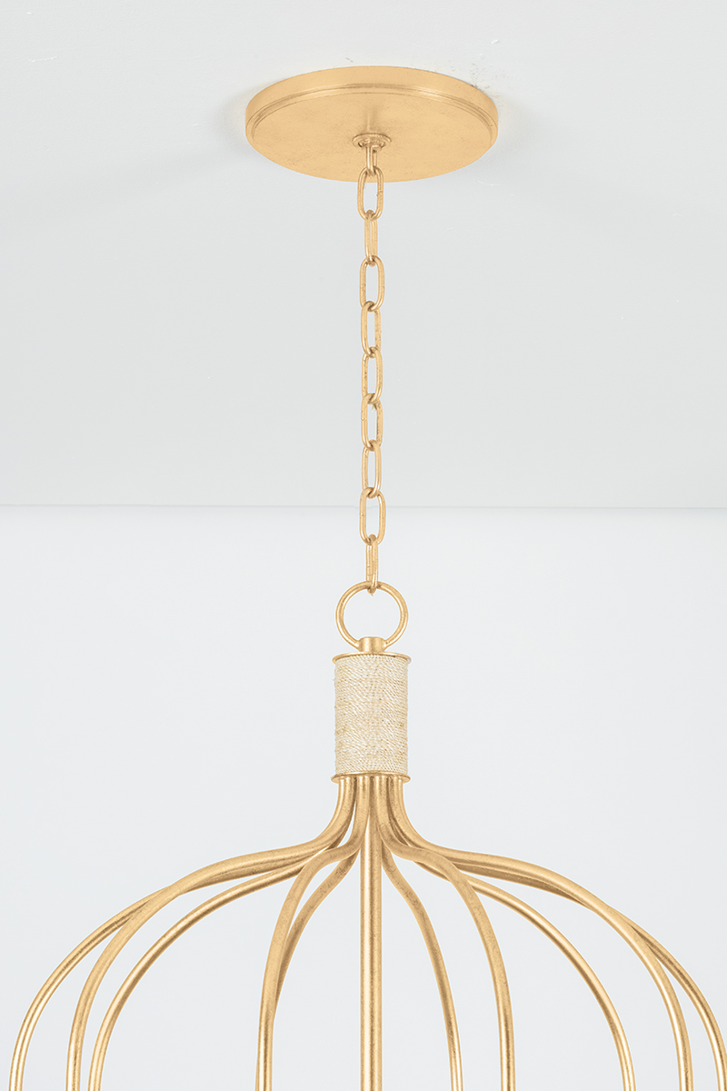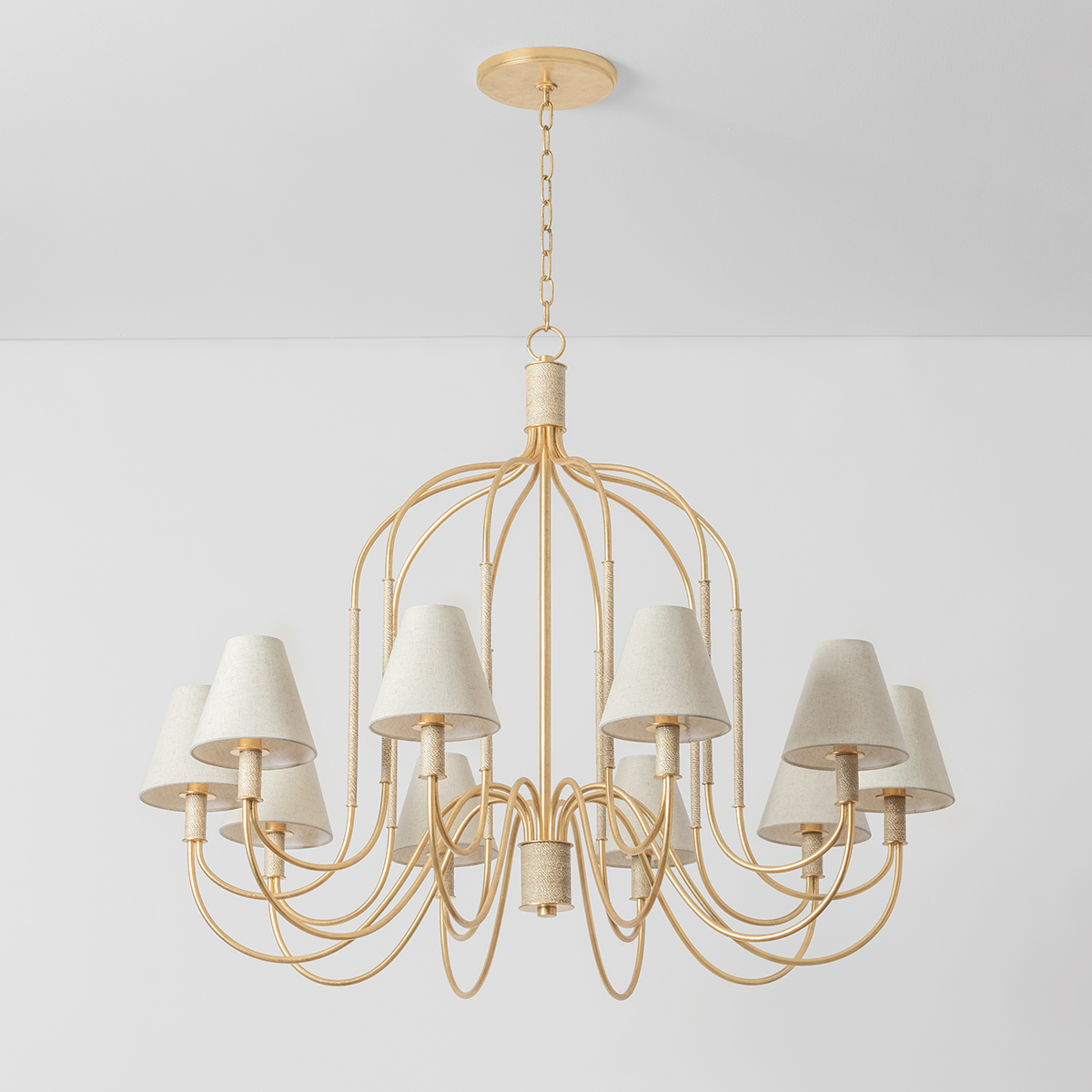 The Parisian-inspired designs of the Warrensburg family channel vintage motifs for a fresh take on romantic lighting. The intricate swooping metalwork recalls the shape of an antique carriage, enhanced by the glamorous Vintage Gold Leaf finish. Subtle Abaca-wrapped details and linen shades add natural, artisanal elements. Whether as a 1-light sconce or 6 or 10-light chandelier, Warrensburg brings a dose of fantasy to modern and traditional spaces.