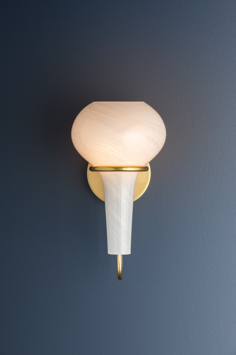 A delicate metal framework supports the upside-down, pear-shaped shade of the Adams Corner sconce. Adding a surprising twist to a vintage silhouette, the swooping metal J-arm is paired with a swirled cloud glass shade. Choose from Aged Brass or Black Nickel metalwork for a more luxurious or industrial finish.