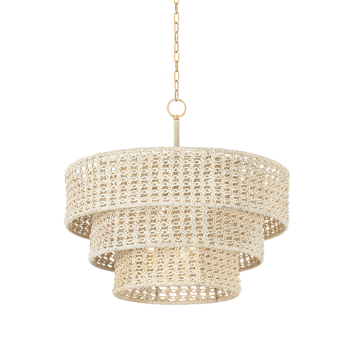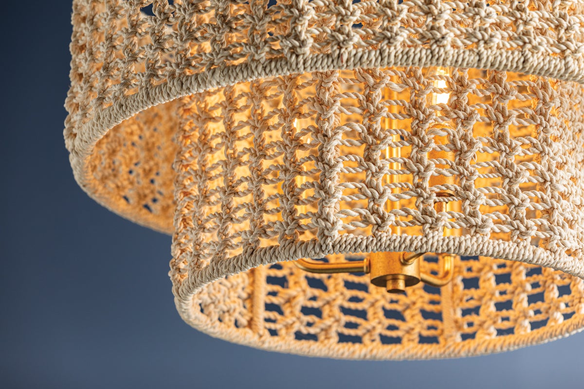 Finely handwoven from bleached abaca rope, Yorkhill channels bohemian style with its macramé-like design. This pendant lantern features a two-tier structure with classic drum shades that softly filter the light. Suspended from a Vintage Gold Leaf rod and chain, Yorkhill infuses any space with coastal, airy beauty.