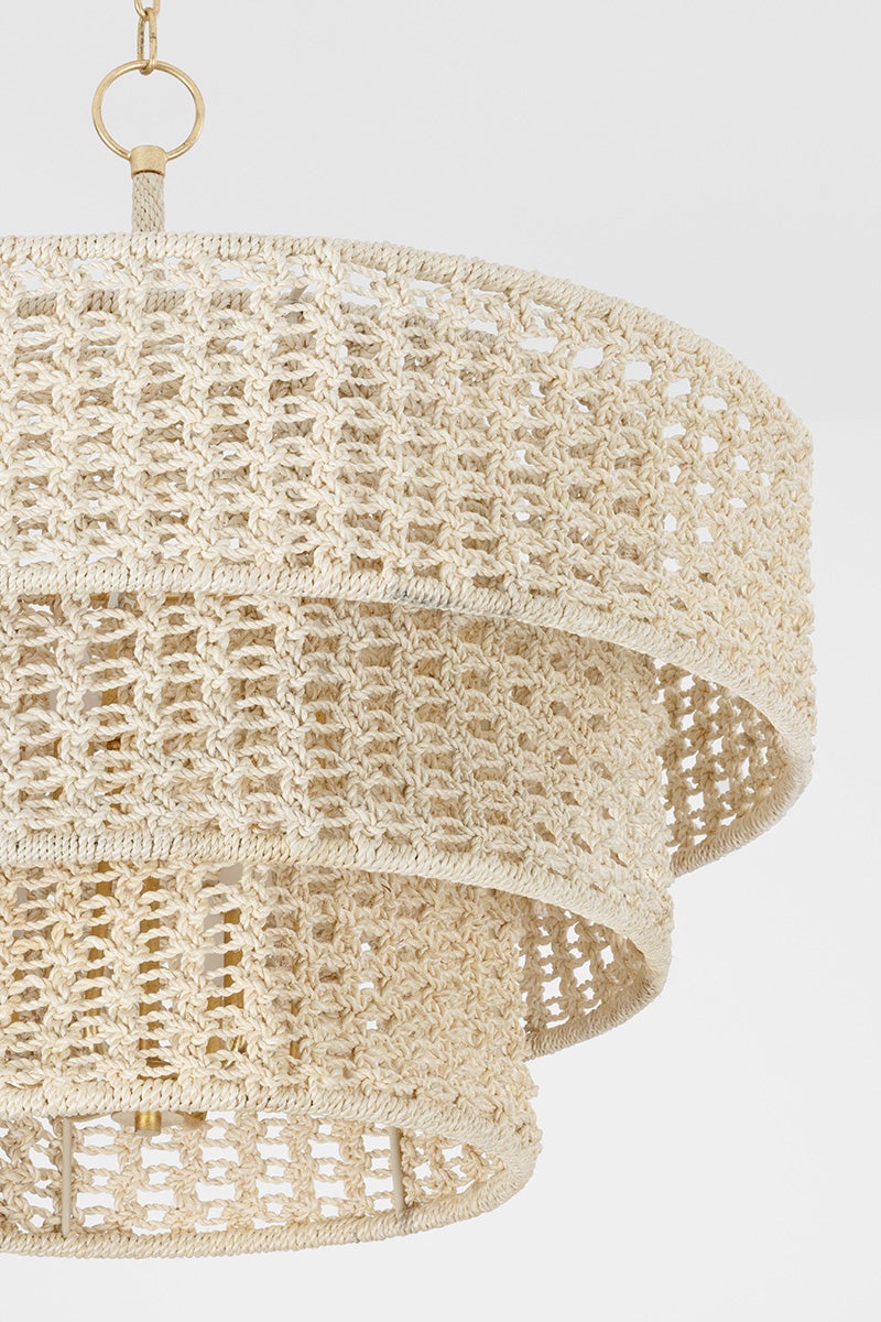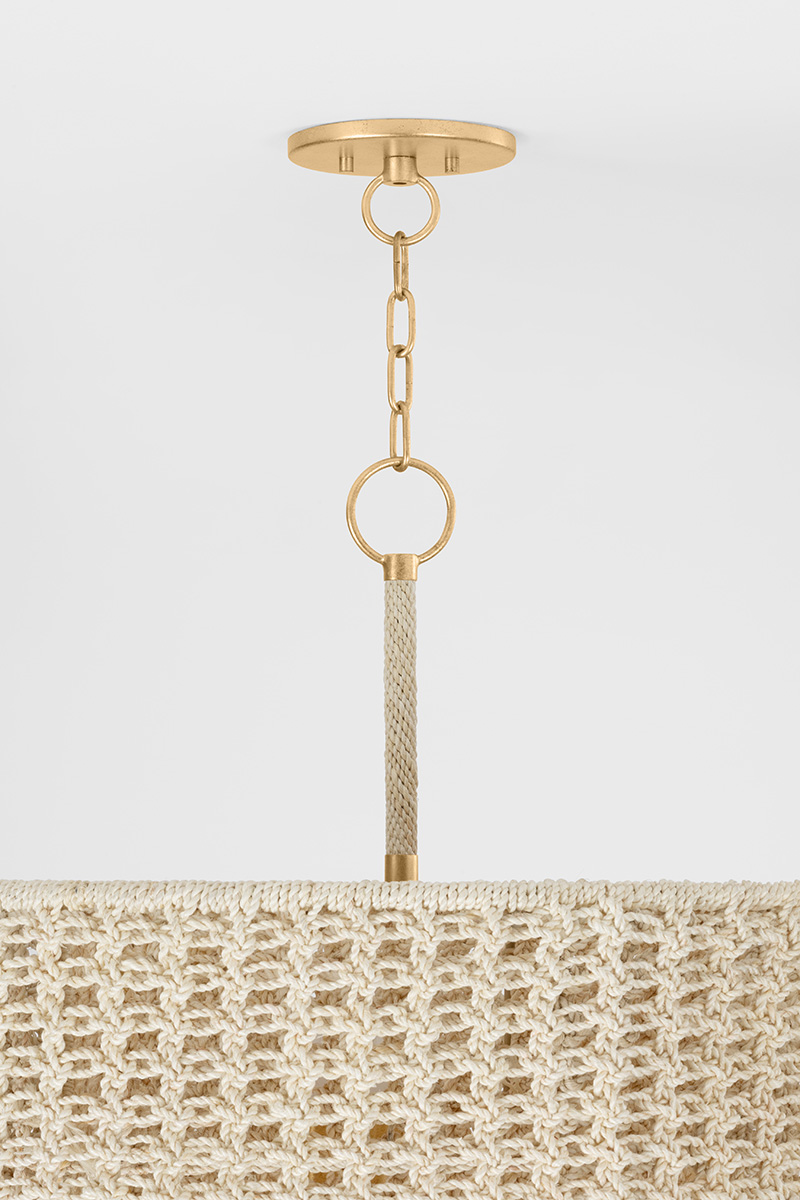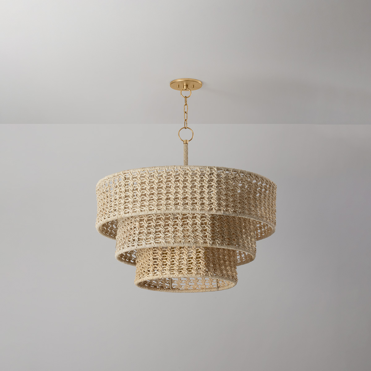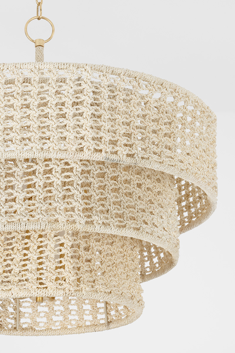 Finely handwoven from bleached abaca rope, Yorkhill channels bohemian style with its macramé-like design. This pendant lantern features a two-tier structure with classic drum shades that softly filter the light. Suspended from a Vintage Gold Leaf rod and chain, Yorkhill infuses any space with coastal, airy beauty.