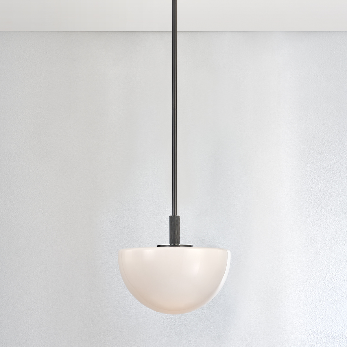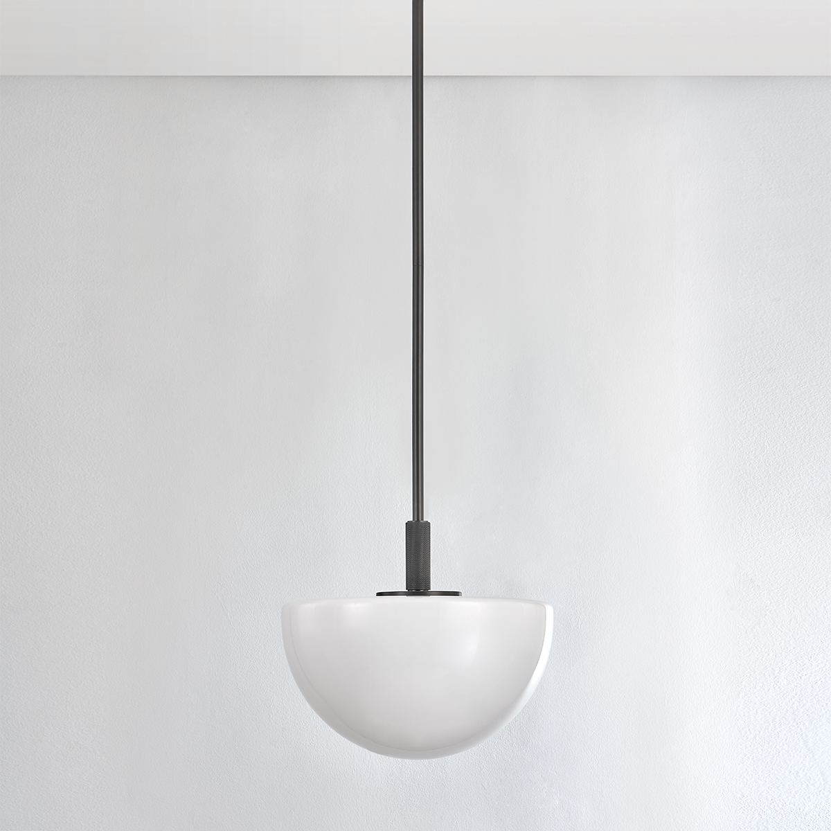 A half-round opal glossy glass shade with knurled metal details and a simple domed canopy give Lethbridge a modern industrial aesthetic. Available in three sizes and three classic finishes, this versatile pendant can work in various design styles.