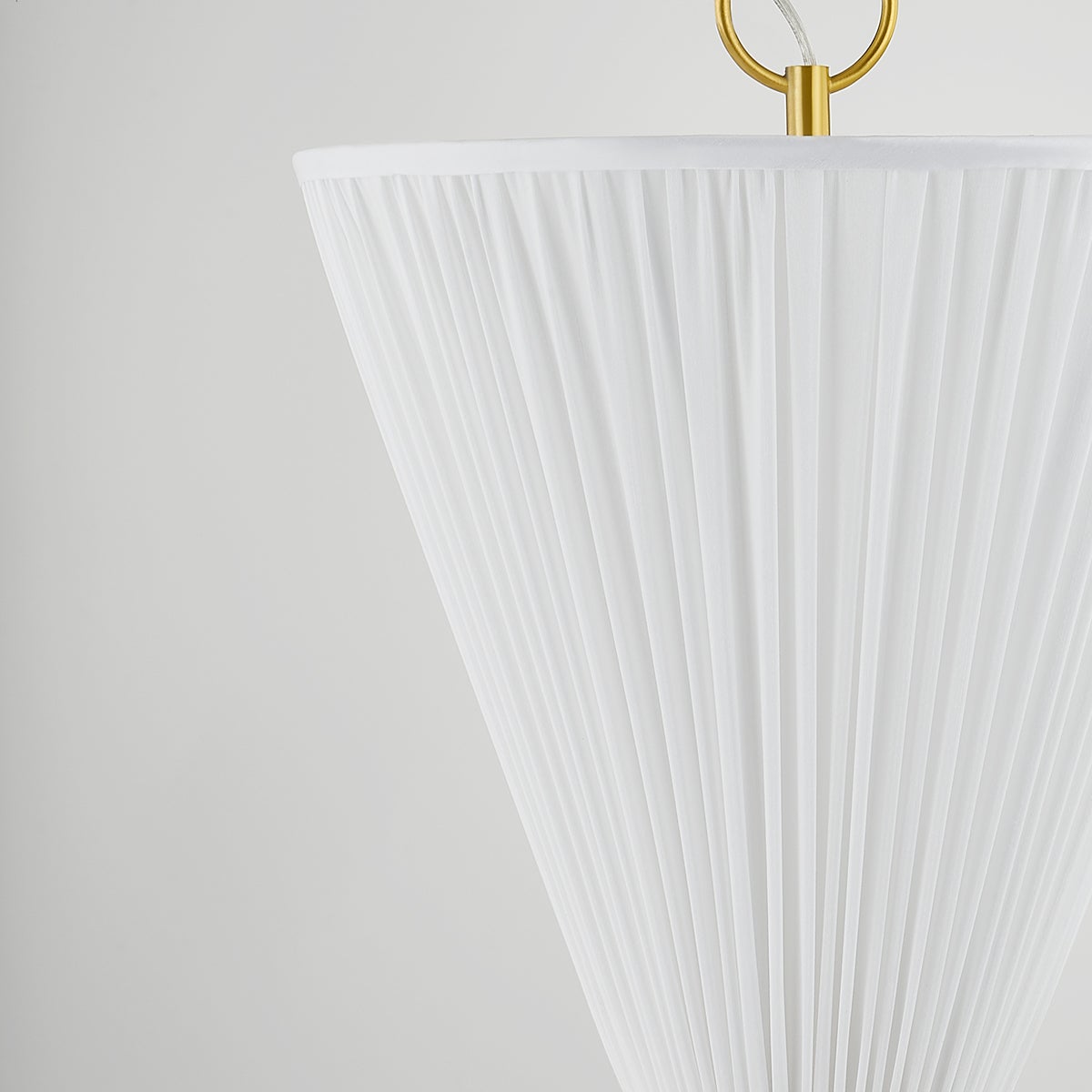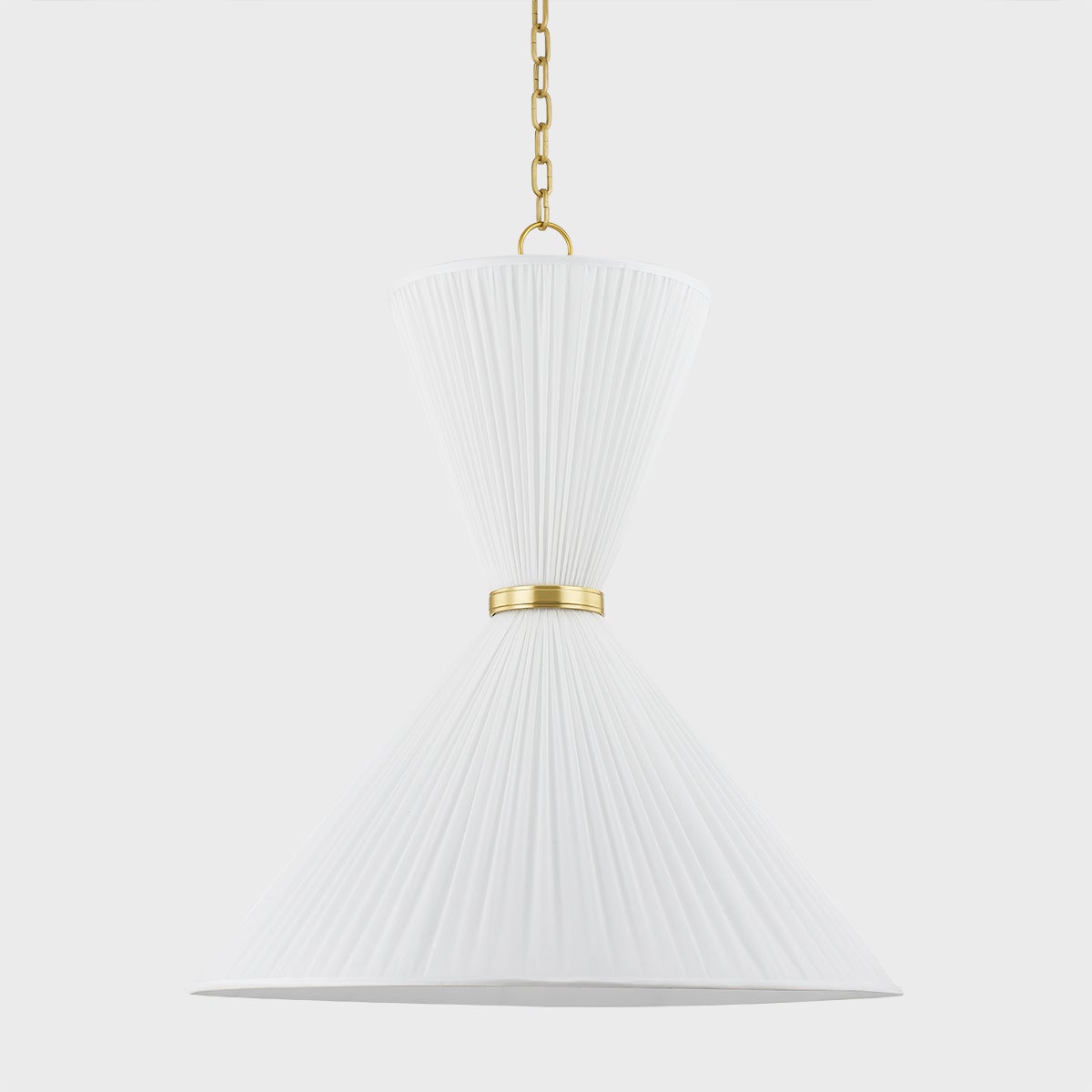 A gathered white linen shade is wrapped in a ring of Aged Brass to create Enid's beautiful, tapered hourglass silhouette. The ruffled look and asymmetry between the top and bottom give the design a loose, flowy element that looks very natural. Add a soothing, soft glow and an organic aesthetic to interiors with this clean, crisp pendant.