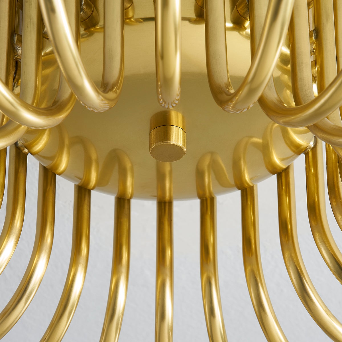 This stunning chandelier draws influence from Stilnovo designs but updates the original mid-century styling with gorgeous machined details. Fluted socket cups extend from sweeping Aged Brass arms to create a dynamic, sprawling silhouette. The small glass globes have a big impact, illuminating an entire space with a 360-degree display of light.