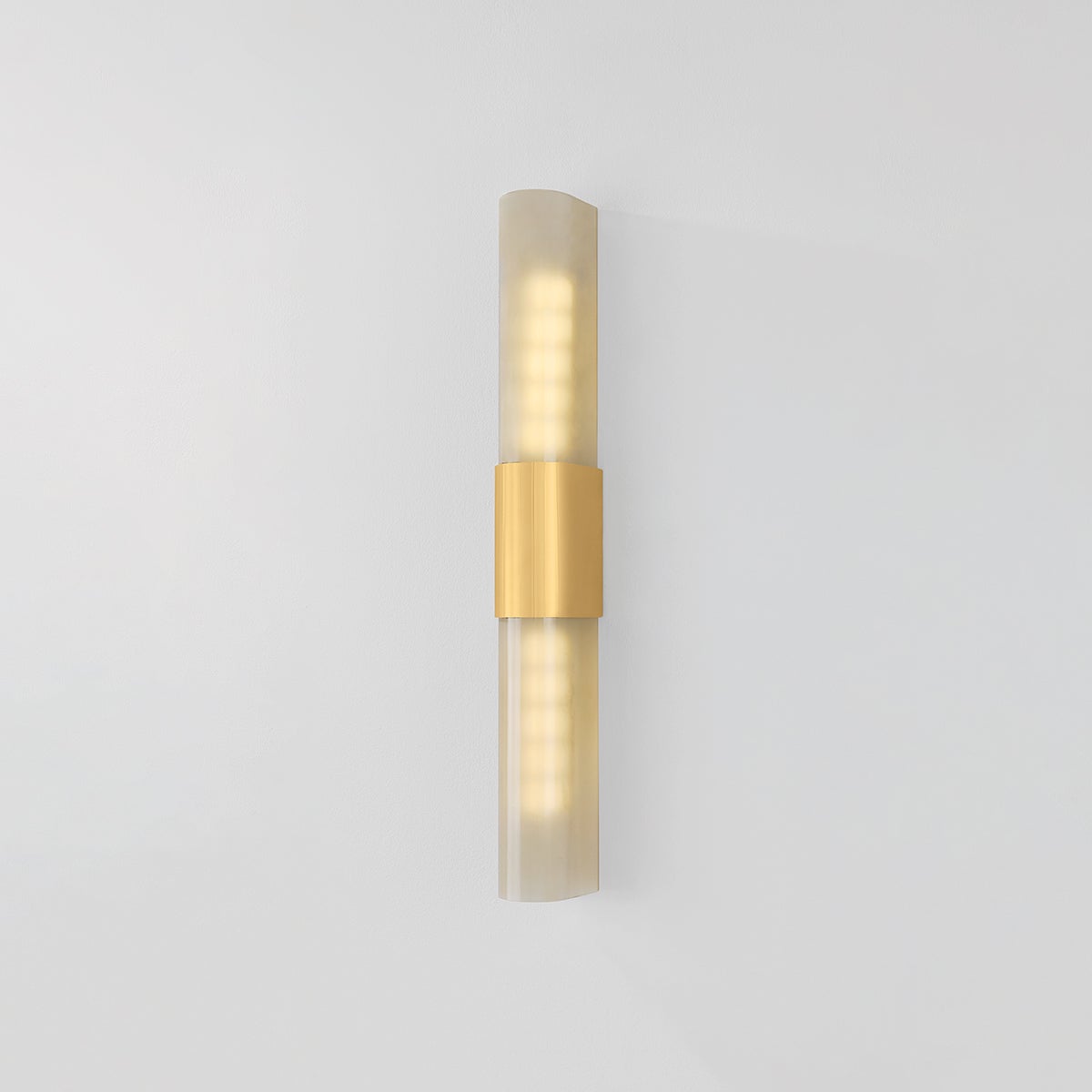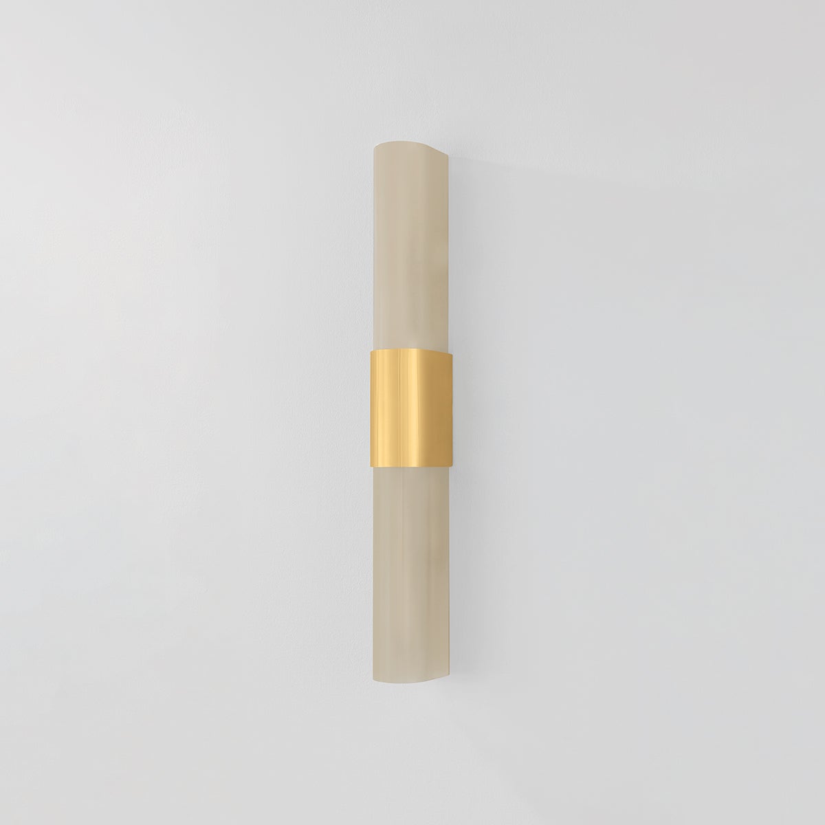 Melding bronze glass with sleek metalwork, the Somersville family includes two timeless, versatile sconces. Suited for a variety of small spaces, the bullnose shape of these fixtures creates a monolithic look. The light bronze glass is etched inside, creating a softly patinated appearance that conceals the light source. When illuminated, the Aged Brass finish of the metalwork glints off the glass shade.
