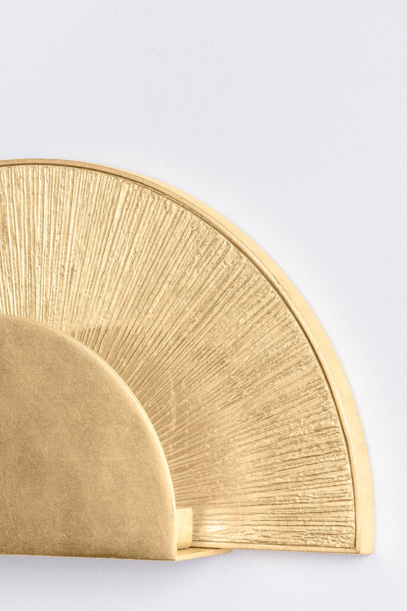 Retro meets modern in this fan-shaped flush mount wall sconce. A hidden LED emits a radiant glow through the brushed Vintage Gold Leaf fixture. Reminiscent of sunbeams, it makes a striking impression in a bedroom, living room, hallway, or entry.