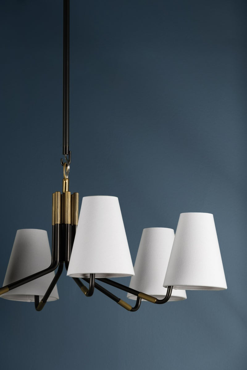 Inspired by a chandelier from the 1930s, the Stanwyck wall sconce and chandelier take traditional elements, like the arm shape and tapered shades, and updates them with a fresh material combination and machined details. Slender Distressed Bronze arms, accented with Aged Brass caps and knurled bands, swing up at the end to hold white linen shades. The chandelier has a beautiful hook-and-ring detail and the shades are mounted off-center, adding more visual interest to this modern design.