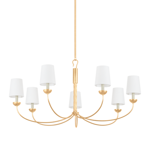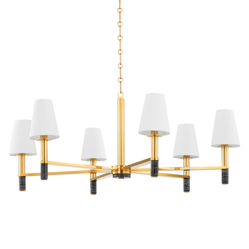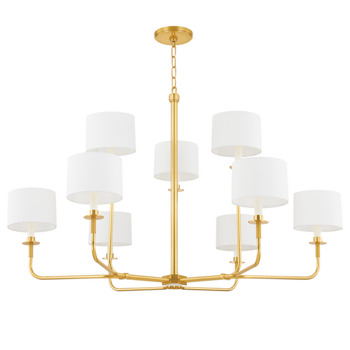 Vintage meets modern in the Amina family. Traditional Victorian metalwork details, including wide bobeches, are paired with contemporary candle sleeves and short white linen shades. Finished in Aged Brass, the slender, elongated J-arms feature a dramatic swoop. Whether as a sconce or 5 or 9-light chandelier, Amina provides a fresh update to traditional forms.