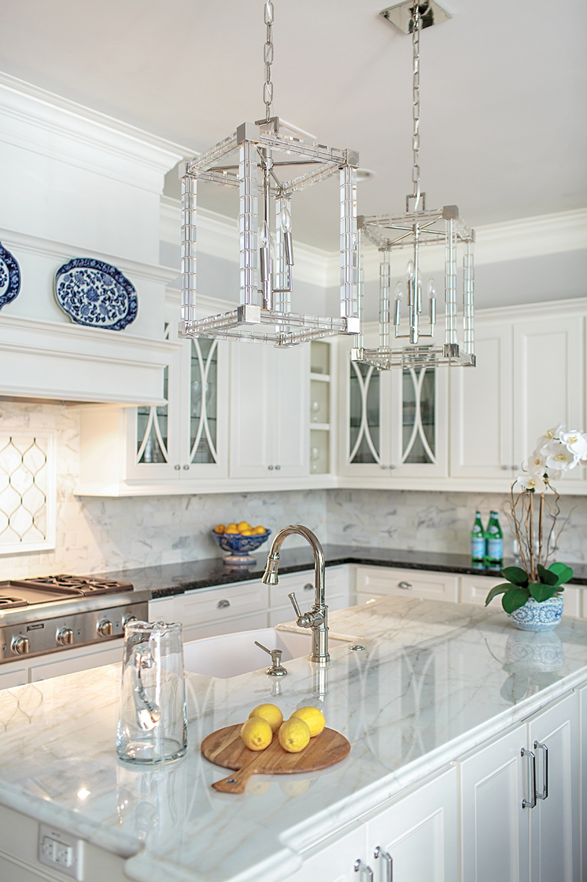 The fixture’s unexpected impact comes from its futuristic materials and shapes and its icy crystal cubes, stacked along the metal frame. Subtly staggered clusters of candelabra lamps cast a sparkling glow along this prismatic frame, playing a brilliant light pattern across any room. Polished Nickel preserves the fixture’s winter chill while Aged Brass accents add warming contrast.