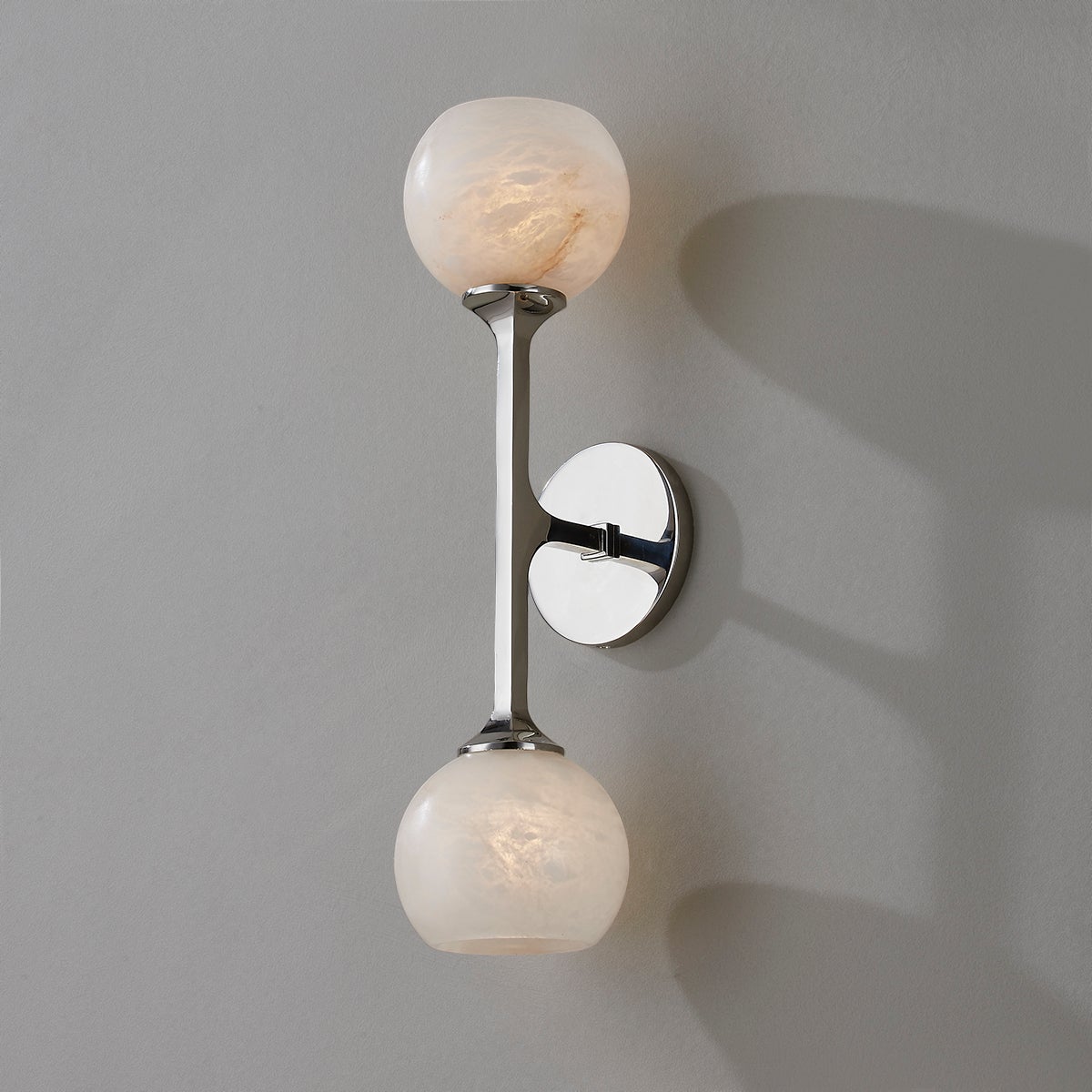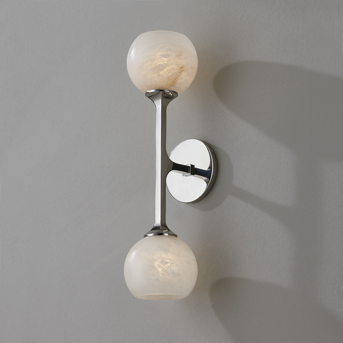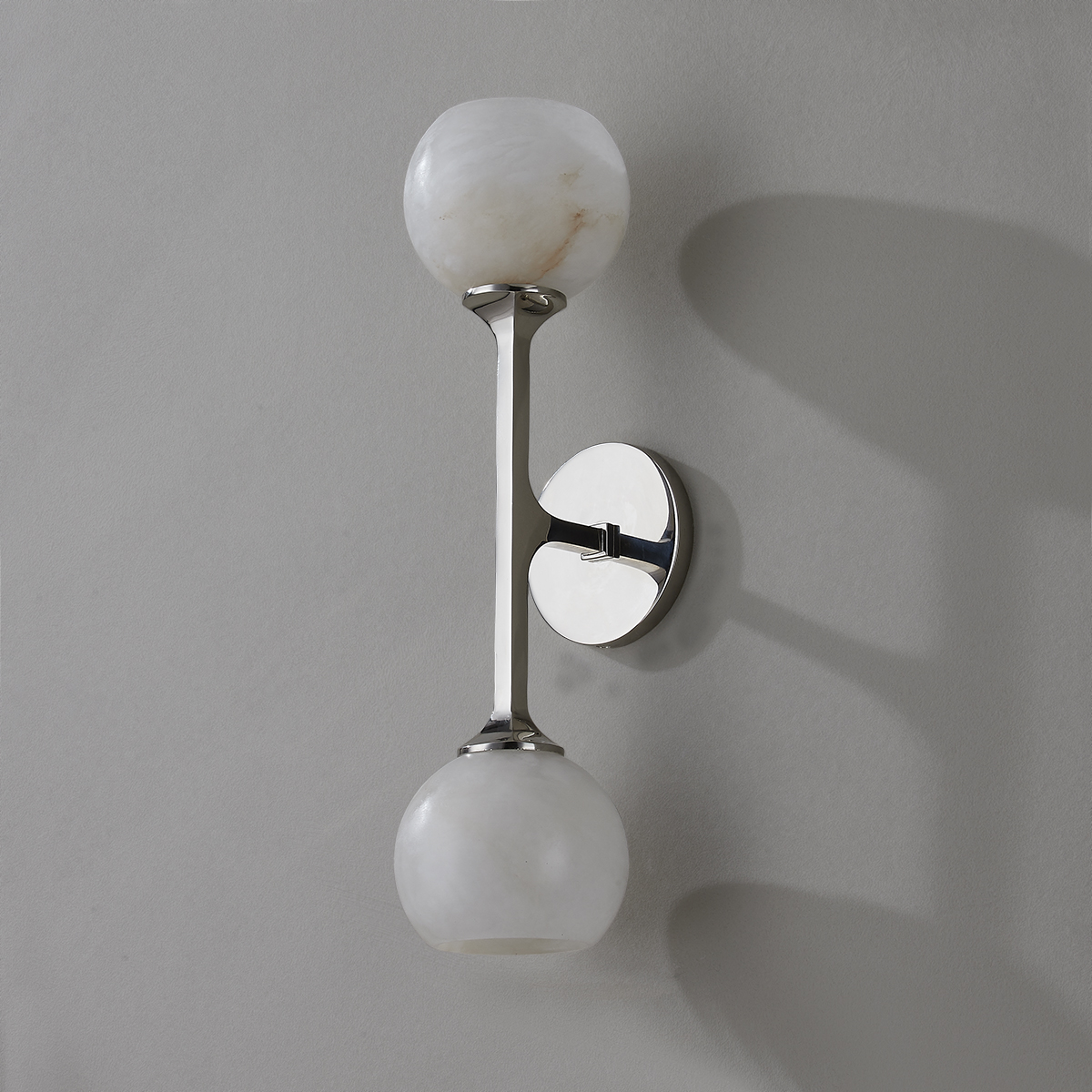 Gorgeously shaped cast metal arms in Aged Brass or Polished Nickel hold beautiful alabaster globe shades to create Melton's elegant, luxurious design. A soft glow fills the alabaster and accentuates the material's unique veining. Available as a 1-light sconce or 2-light.