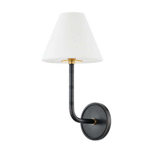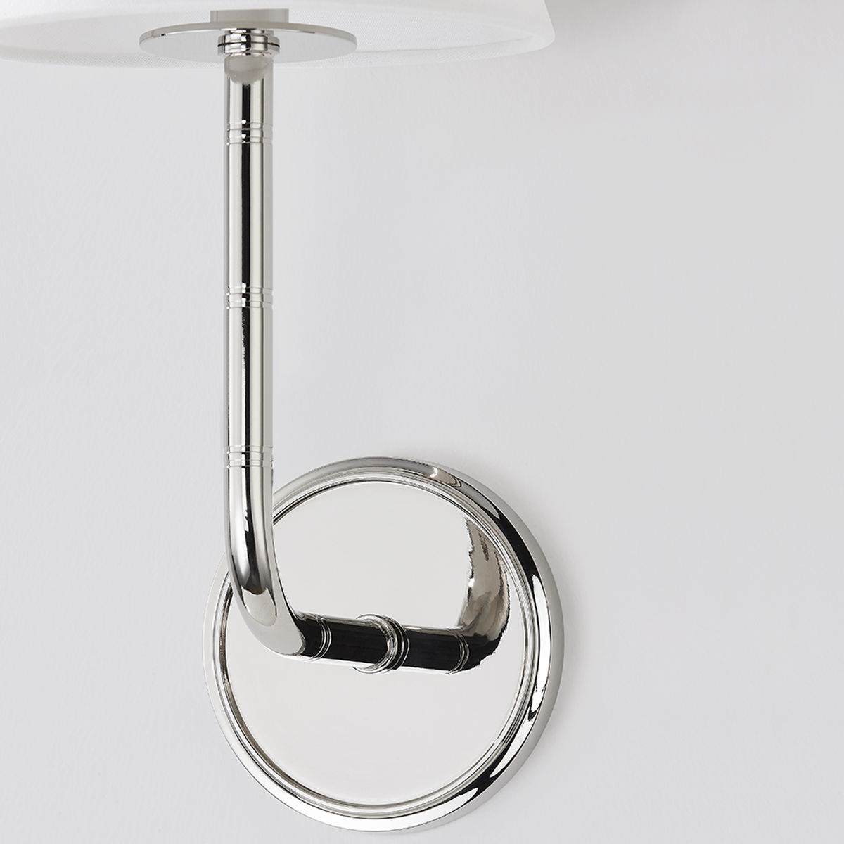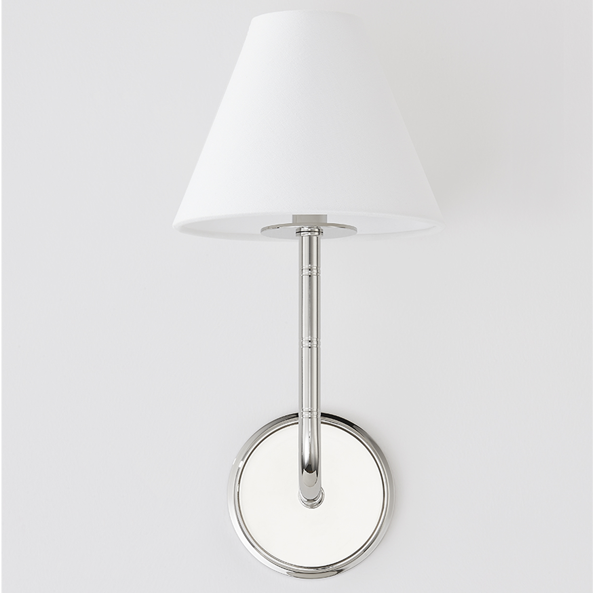 Instantly recognizable and endlessly useable, this familiar sconce form features a tapered white linen shade, slender curved arm and round backplate for a classic, refined look. The subtle bamboo-inspired ribbing in the metalwork gives a nod to the natural and draws the eye. In an allover Polished Nickel or two-tone Aged Brass and Old Bronze finish, style this sconce alone or in multiples in areas throughout the home.