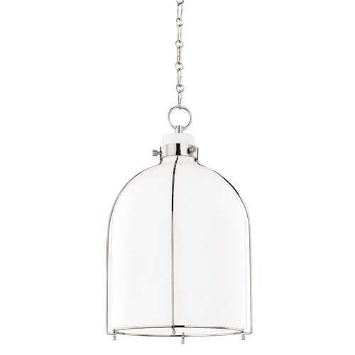 Eldridge is a minimalist cage pendant with maximum style. Light pours through the glass shade and allows the lamp socket within to shine. Available in a conical and a dome shape with Aged Brass, Old Bronze or Polished Nickel finishes, these pendants suspend from gorgeously detailed hook and loop chains.