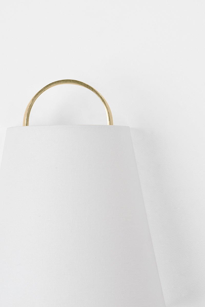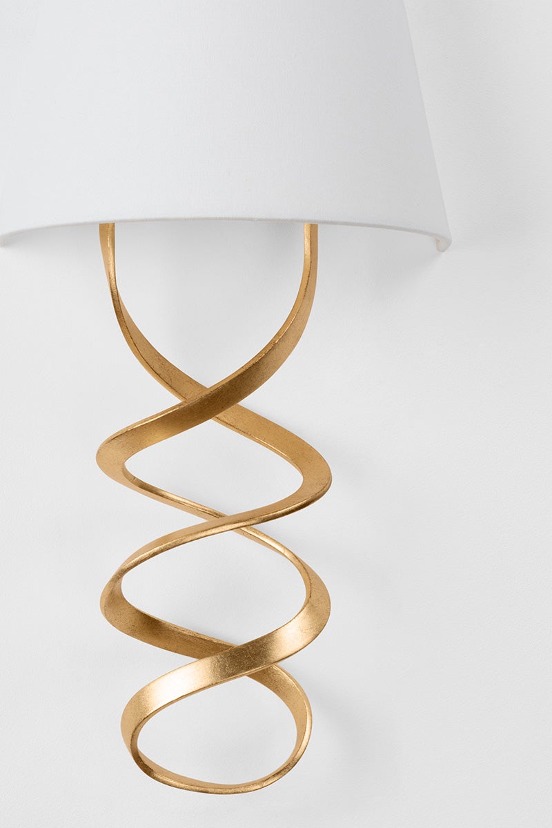 Dota's gorgeous flowing lines are the highlight of this playful yet elegant sconce. Curved metalwork in Vintage Gold Leaf or Warm Silver Leaf twists and swirls in a tranquil loop that draws the eye and creates an open, airy spiral silhouette against the wall. The tapered white linen shade grounds the design and adds a traditional element that makes the piece extremely useable.