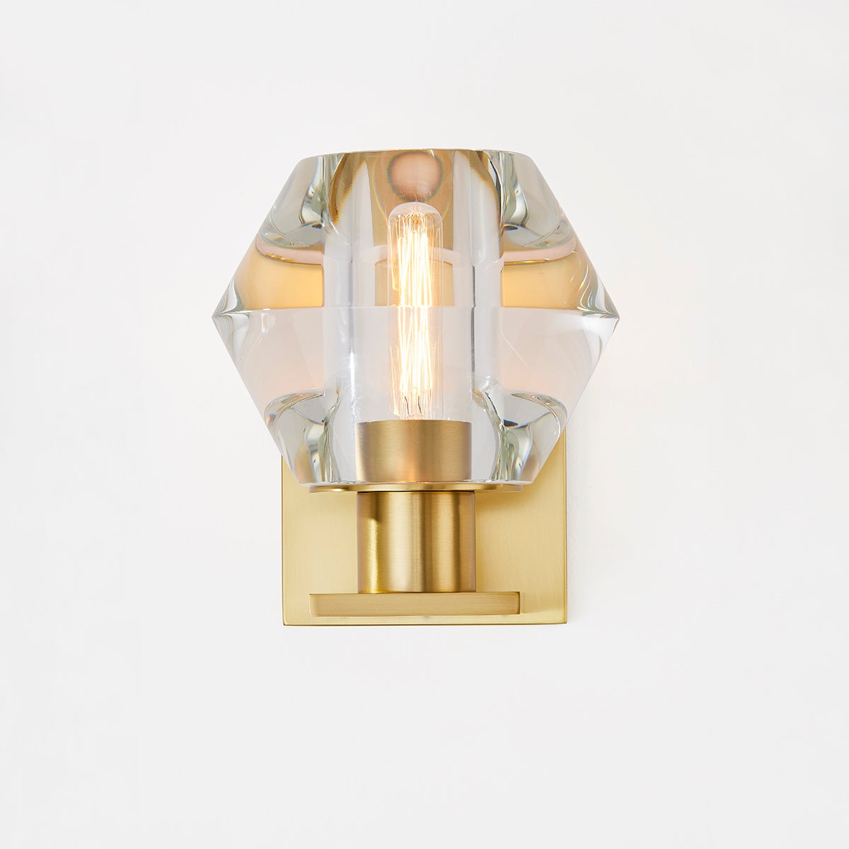 A thick, diamond-shaped crystal is hollowed out to encase a bulb that beautifully fills the fixture with light from within. Chunky Aged Brass metalwork reflects the light and adds to the luxurious look of this striking sconce.
