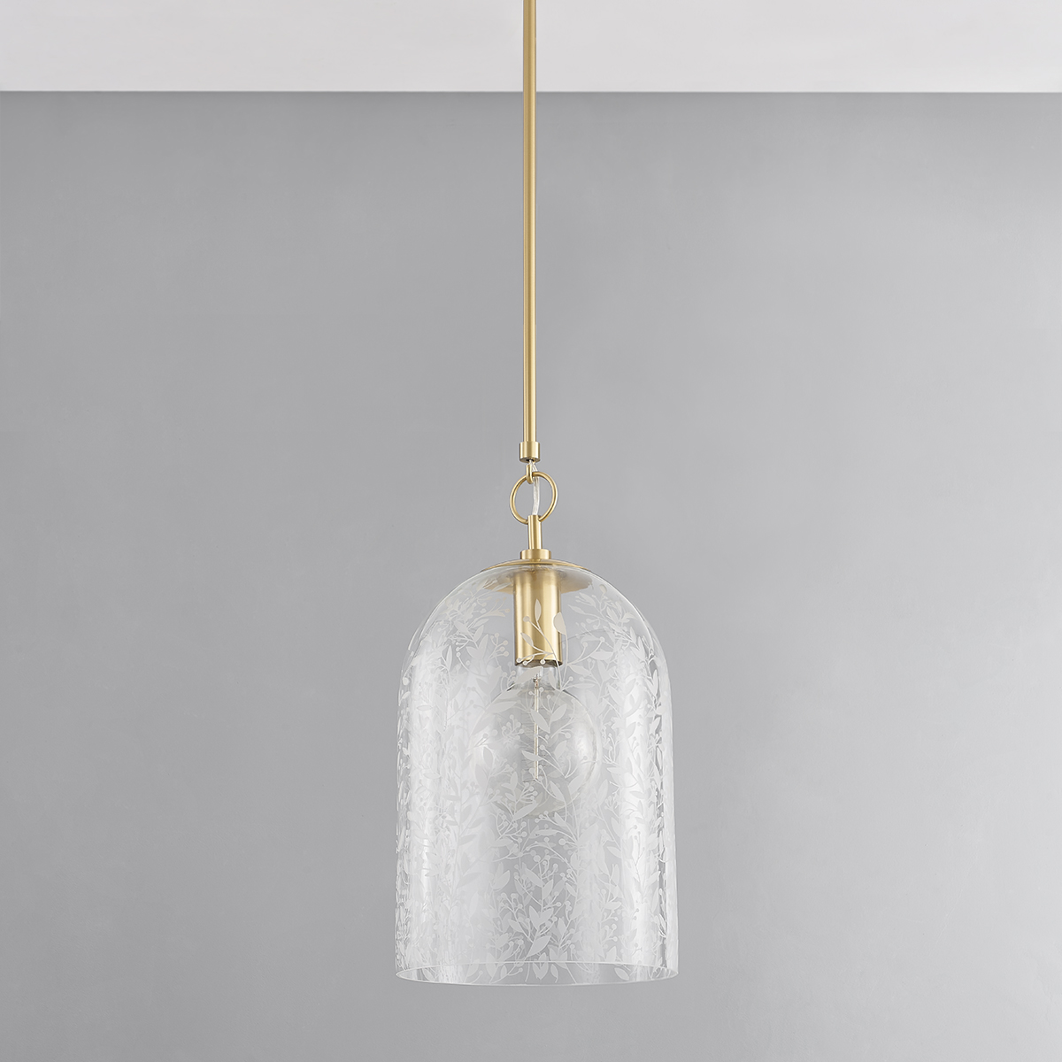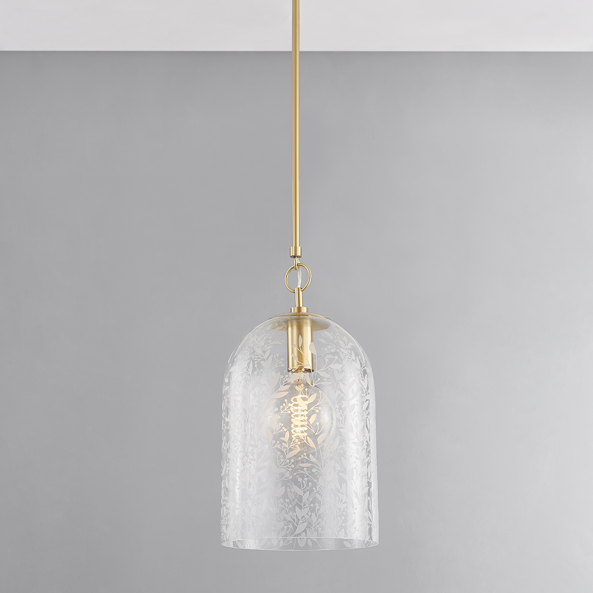 Belleville's simple silhouette becomes simply stunning with its intricate floral etching on the clear glass shade. This pretty pendant fills a room with breathtaking reflections and shadows when lit. Belleville is available as a small and large pendant in two classic finishes.