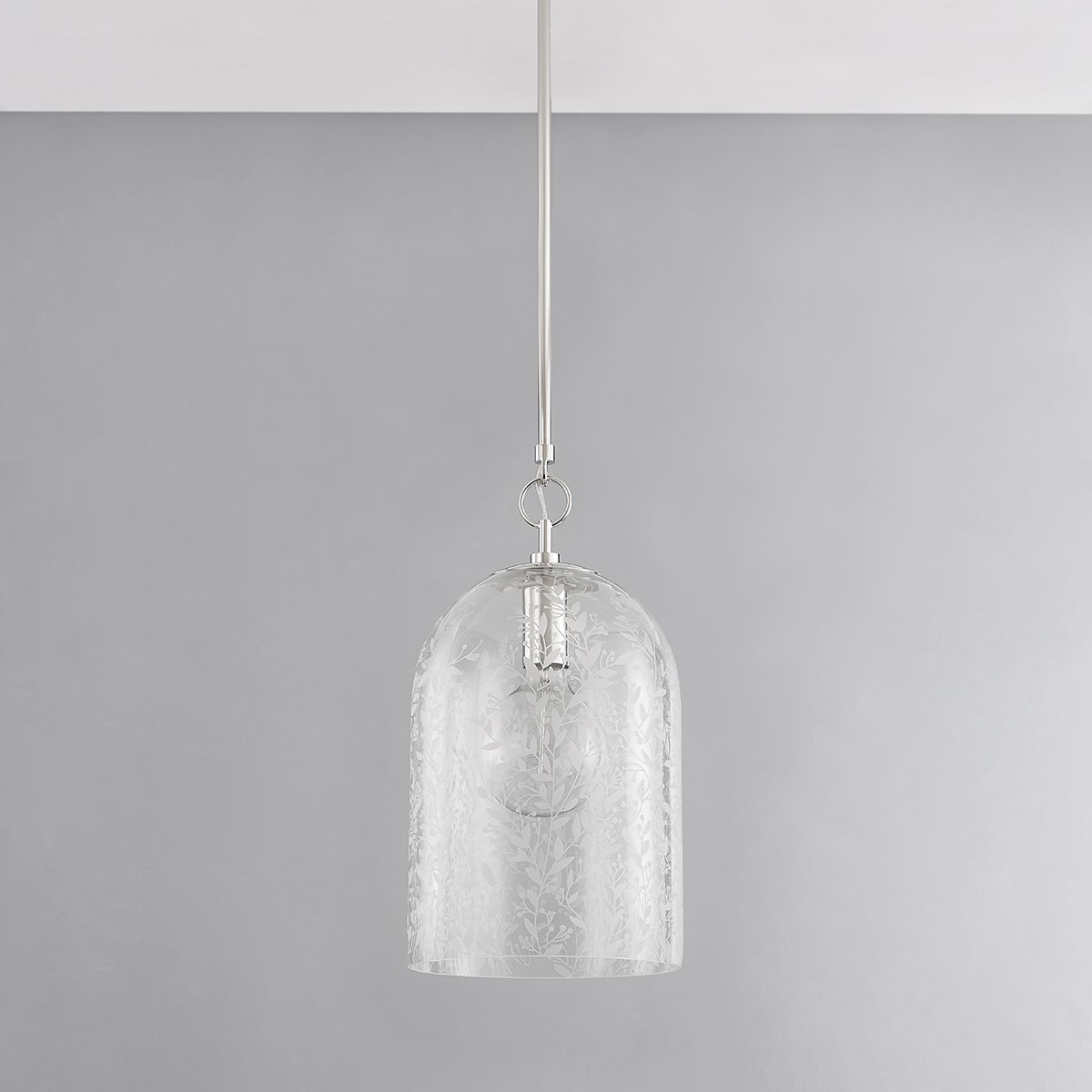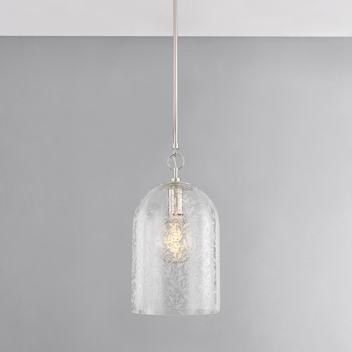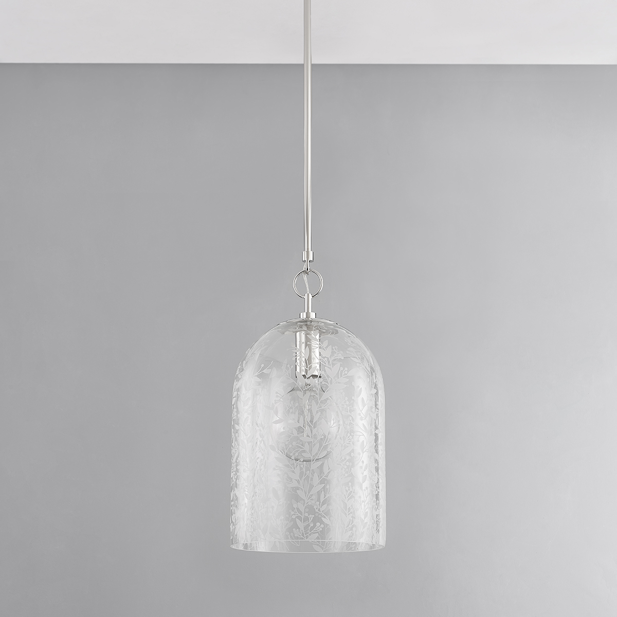 Belleville's simple silhouette becomes simply stunning with its intricate floral etching on the clear glass shade. This pretty pendant fills a room with breathtaking reflections and shadows when lit. Belleville is available as a small and large pendant in two classic finishes.