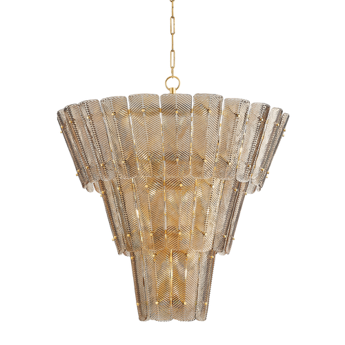 Inspired by Parisian design aesthetics, this graceful tiered glass chandelier is a showstopper. Slender plates of fluted piastre glass are secured to a delicate framework with fine, jewelry-like pins. The glass features an optic chevron pattern that mimics the pattern on leaves, adding textural depth. Cassian is available with 10 or 18 lights.