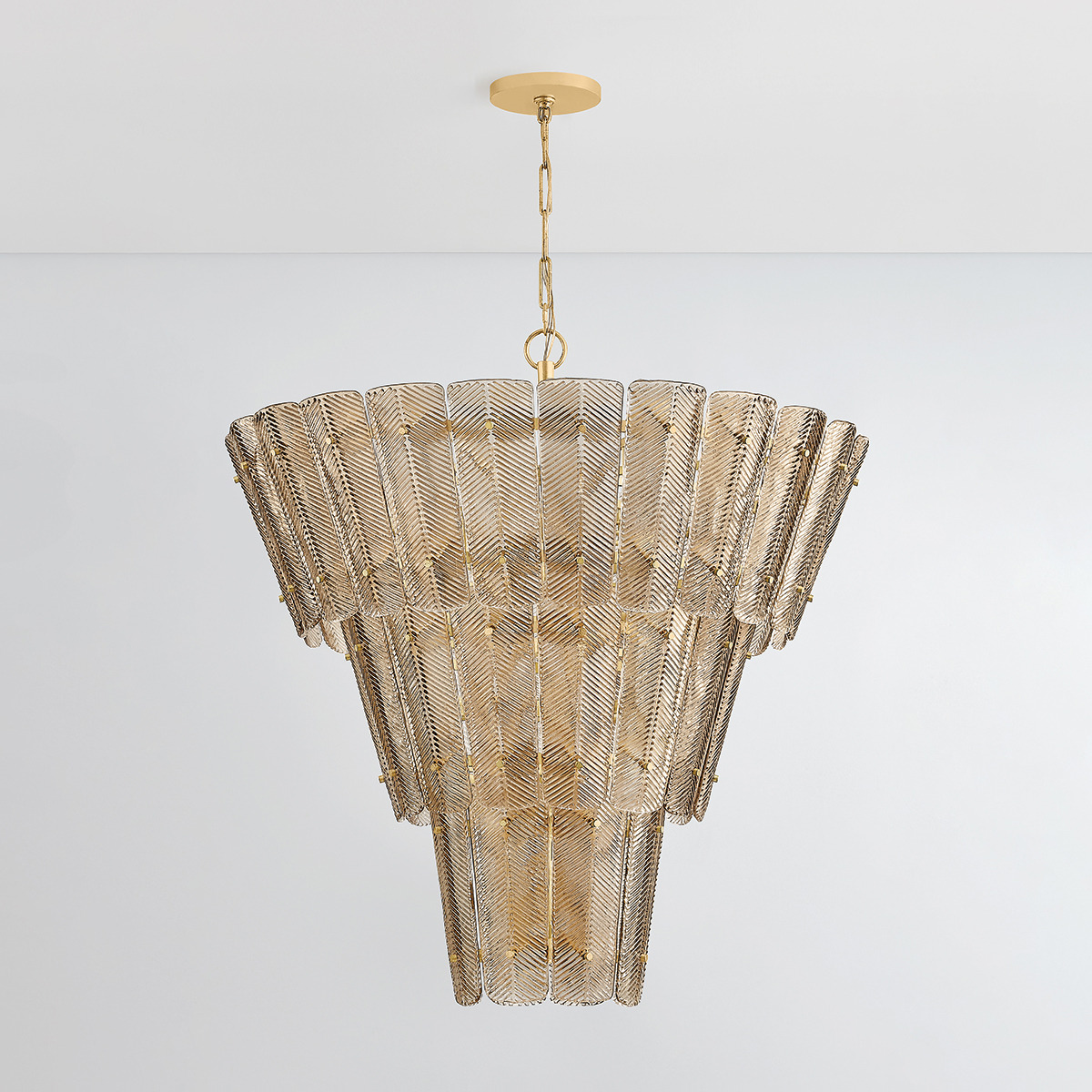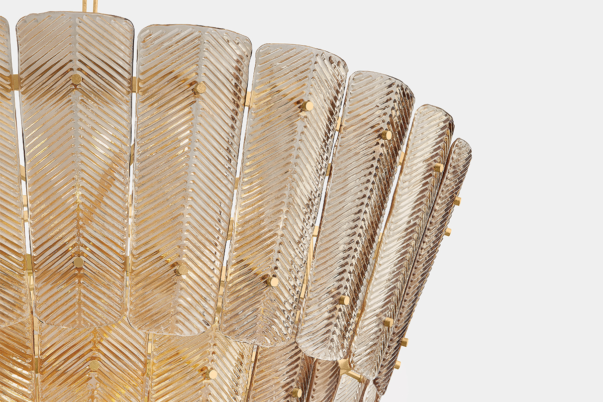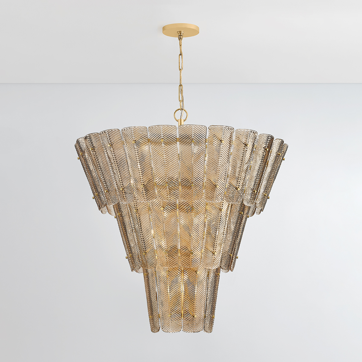Inspired by Parisian design aesthetics, this graceful tiered glass chandelier is a showstopper. Slender plates of fluted piastre glass are secured to a delicate framework with fine, jewelry-like pins. The glass features an optic chevron pattern that mimics the pattern on leaves, adding textural depth. Cassian is available with 10 or 18 lights.