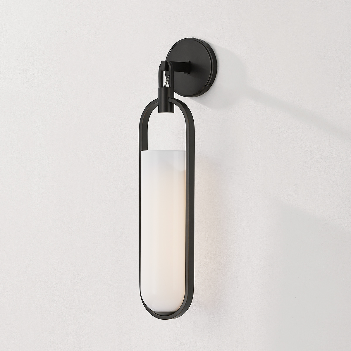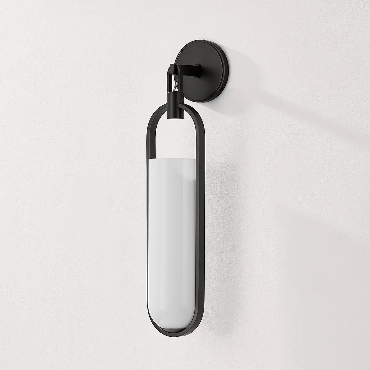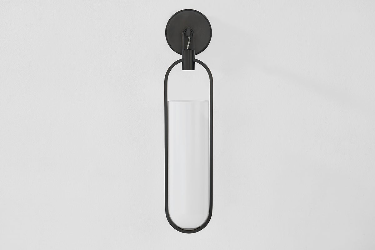 An elegant capsule-shaped sconce featuring a large opal glossy glass bulb, Lorimer dangles like a lantern over small spaces. It is designed as a feature light or can be hung in multiples along a hallway for maximum impact. Based on your chosen finish, it can appear refined with shiny Aged Brass or industrial with a matte Black Brass finish.