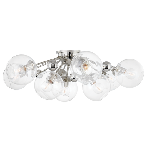 This sprawling semi-flush is a stunning way to cover larger areas in bedrooms, entryways or any space where you want to add a serious touch of sophistication. Like a large piece of art displayed close to the ceiling, the globe-shaped diffusers are made of super clear blown glass. Carbon-filament bulbs are Abbott's perfect accompaniment and beautifully shine through the high-quality, crystalline glass. Available in two sizes (three-light and nine-light) and two finishes (Aged Brass and Polished Nickel).