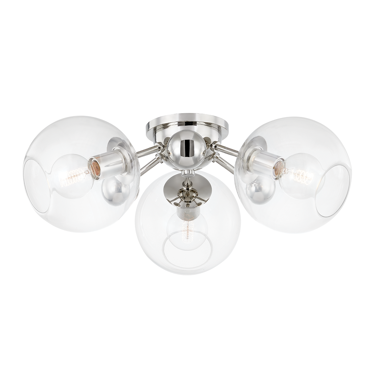 This sprawling semi-flush is a stunning way to cover larger areas in bedrooms, entryways or any space where you want to add a serious touch of sophistication. Like a large piece of art displayed close to the ceiling, the globe-shaped diffusers are made of super clear blown glass. Carbon-filament bulbs are Abbott's perfect accompaniment and beautifully shine through the high-quality, crystalline glass. Available in two sizes (three-light and nine-light) and two finishes (Aged Brass and Polished Nickel).