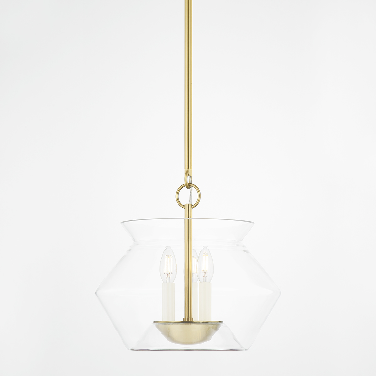 An eye-catching design, Edmonton features an Aged Brass or Polished Nickel arm rising up from a bowl-like vessel creating the illusion that the clear, handblown glass shade is floating around the candlesticks at the center. Combining a modern shape with timeless elements, this stunning lantern is comfortable in many different interiors.