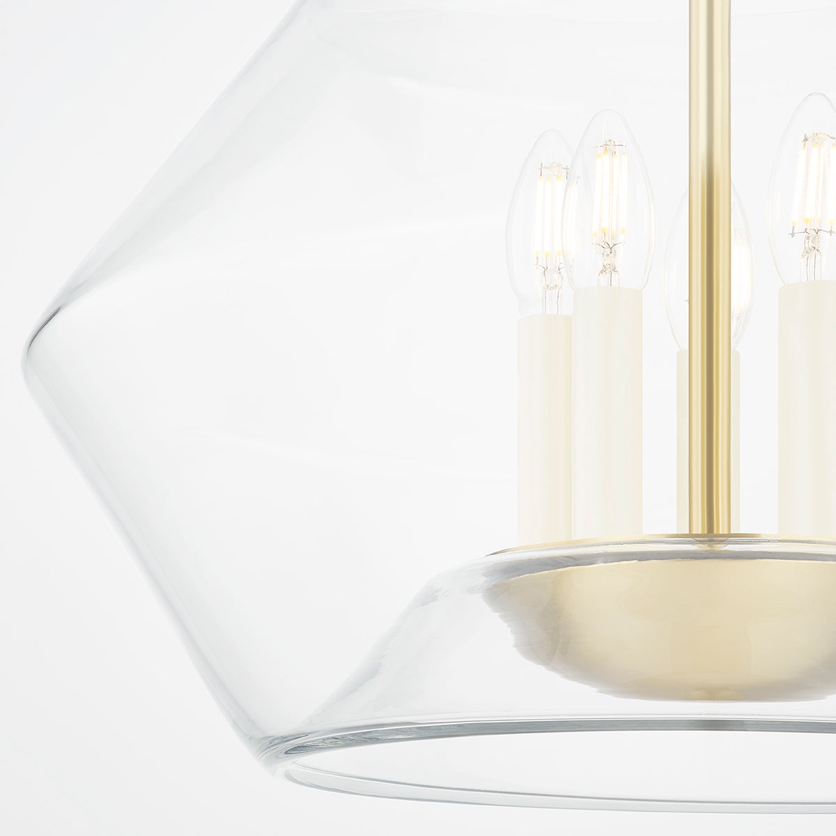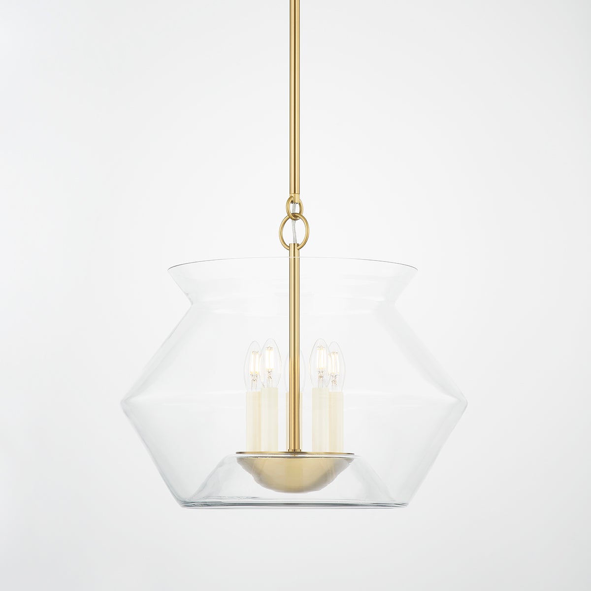 An eye-catching design, Edmonton features an Aged Brass or Polished Nickel arm rising up from a bowl-like vessel creating the illusion that the clear, handblown glass shade is floating around the candlesticks at the center. Combining a modern shape with timeless elements, this stunning lantern is comfortable in many different interiors.