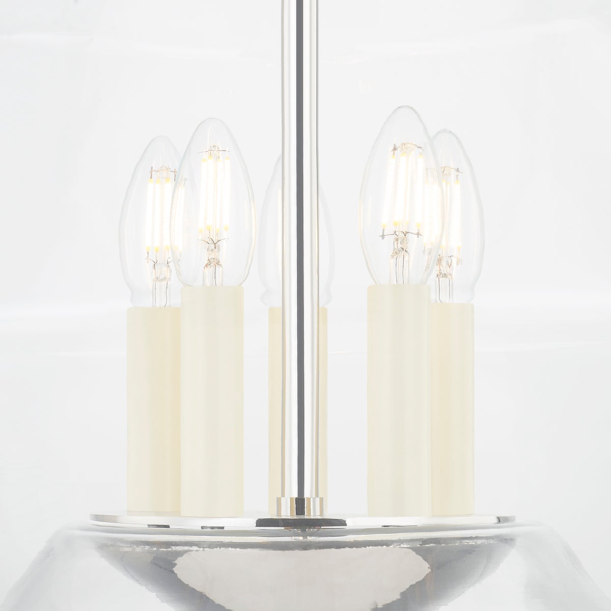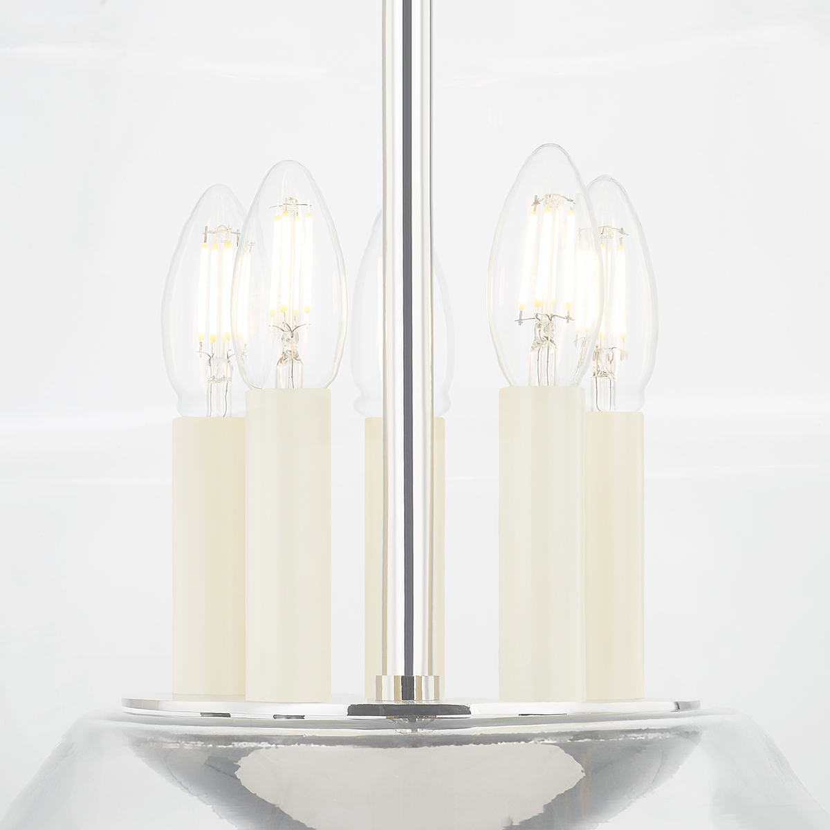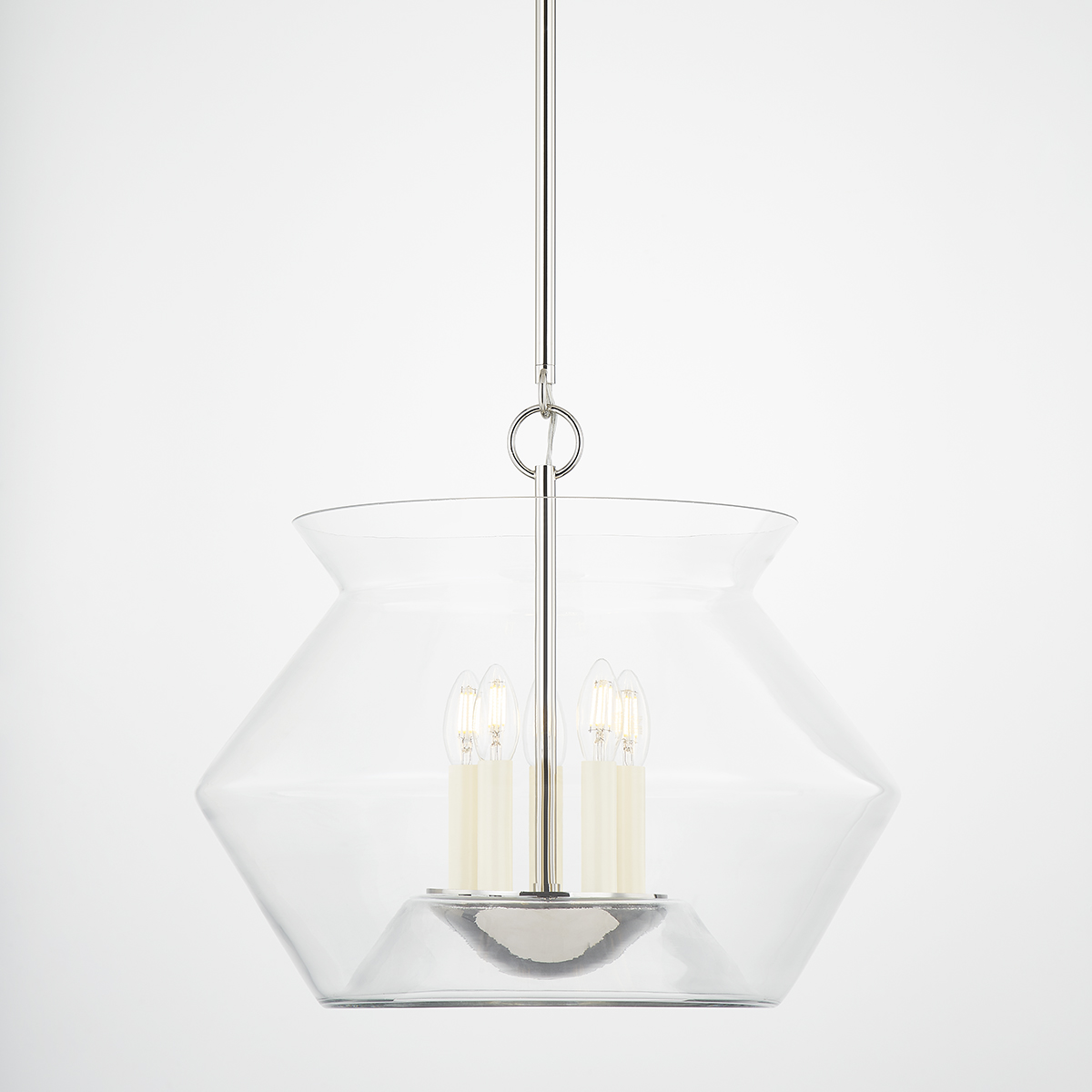 An eye-catching design, Edmonton features an Aged Brass or Polished Nickel arm rising up from a bowl-like vessel creating the illusion that the clear, handblown glass shade is floating around the candlesticks at the center. Combining a modern shape with timeless elements, this stunning lantern is comfortable in many different interiors.
