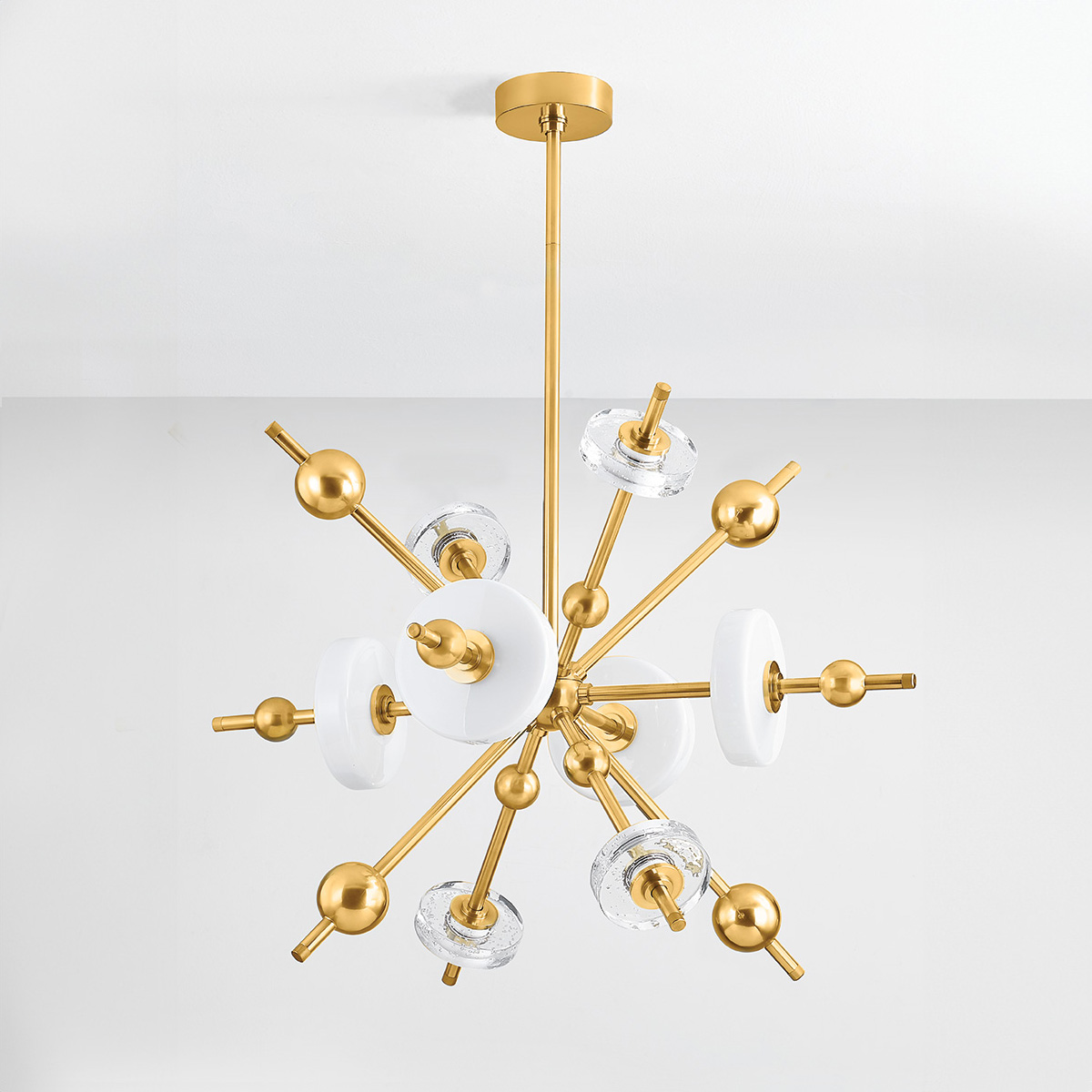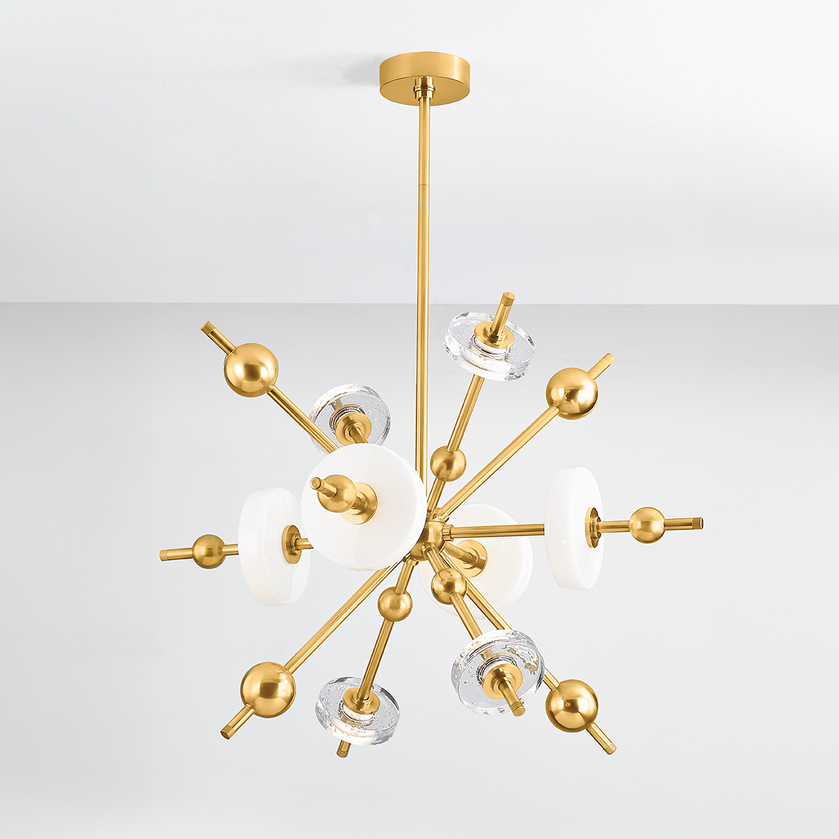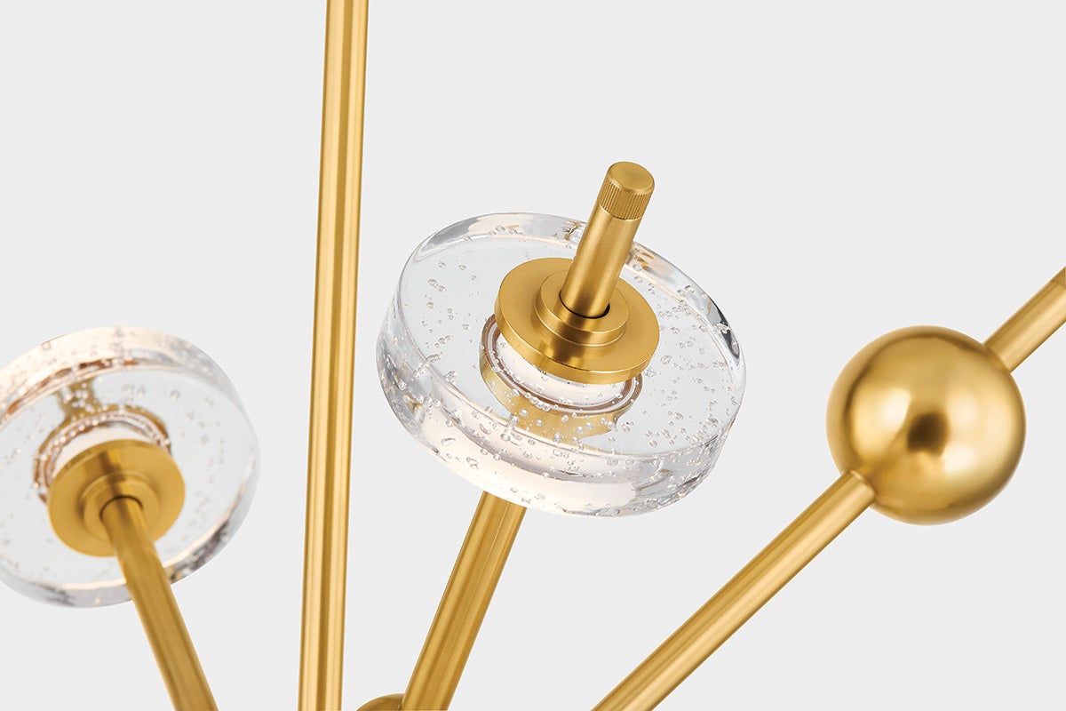 Machine precision and slim LED profiles provide a sleek update to an iconic mid-century silhouette. Glass ornaments, hand-blown from either seedy opal glass or seedy etched glass, stack in totemic formations along the slim arms of this chandelier. An Aged Brass finish elevates the fixture, balancing the playfulness with a note of luxury. Maynard is available as an 8, 12-light chandelier, 6-light linear, or a 3-light sconce.
