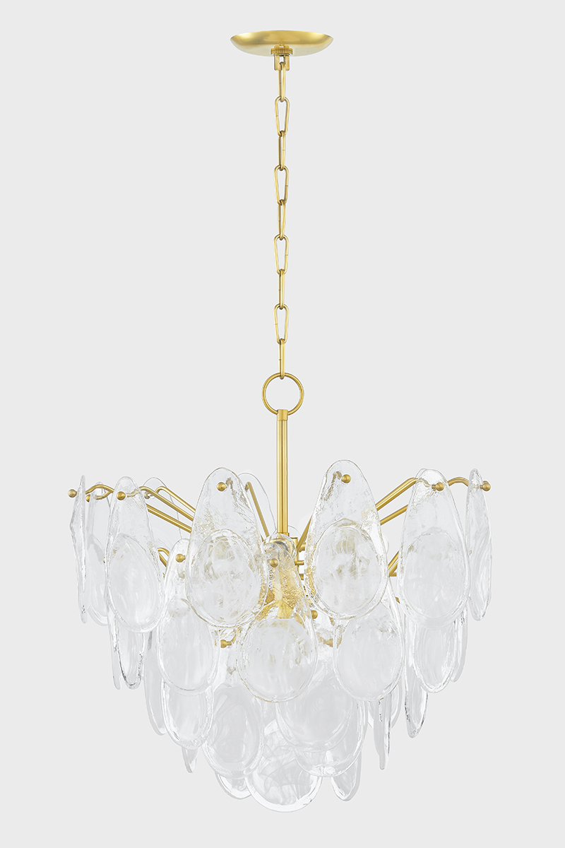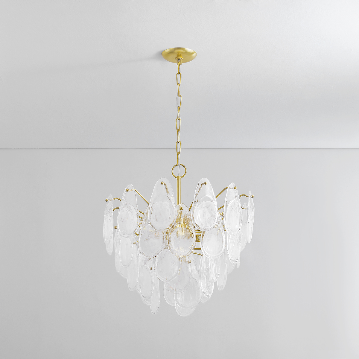 Smooth Blonchino Piastra glass teardrops are suspended in tiers from the waterfall-like Darcia. Reminiscent of shells or falling rain, the hand-blown glass pieces sparkle as they soften and diffuse the light. Available as a sconce, or as a chandelier in three sizes, Darcia makes a poetic and organic statement.