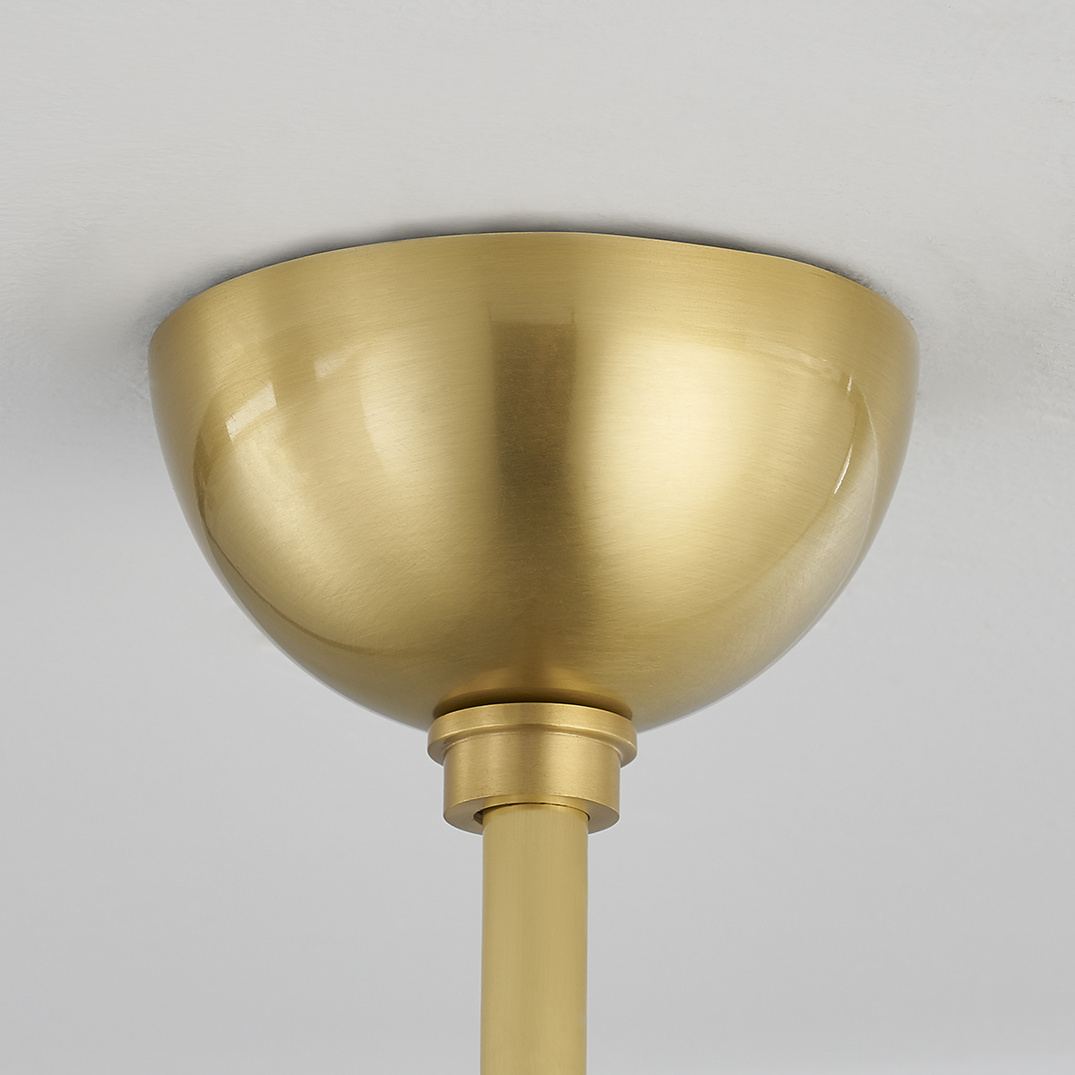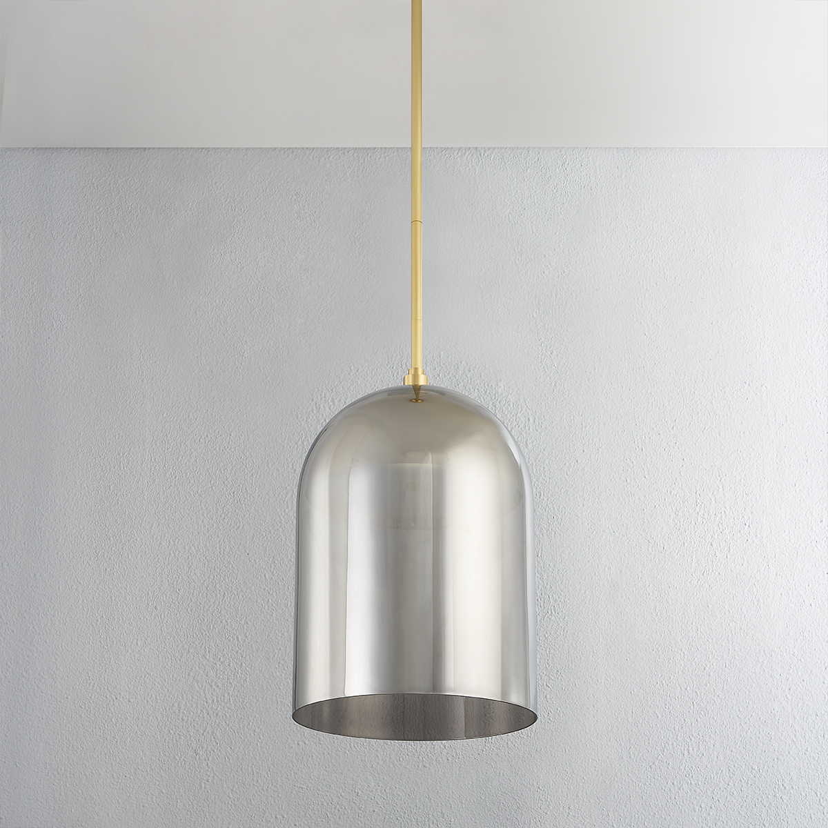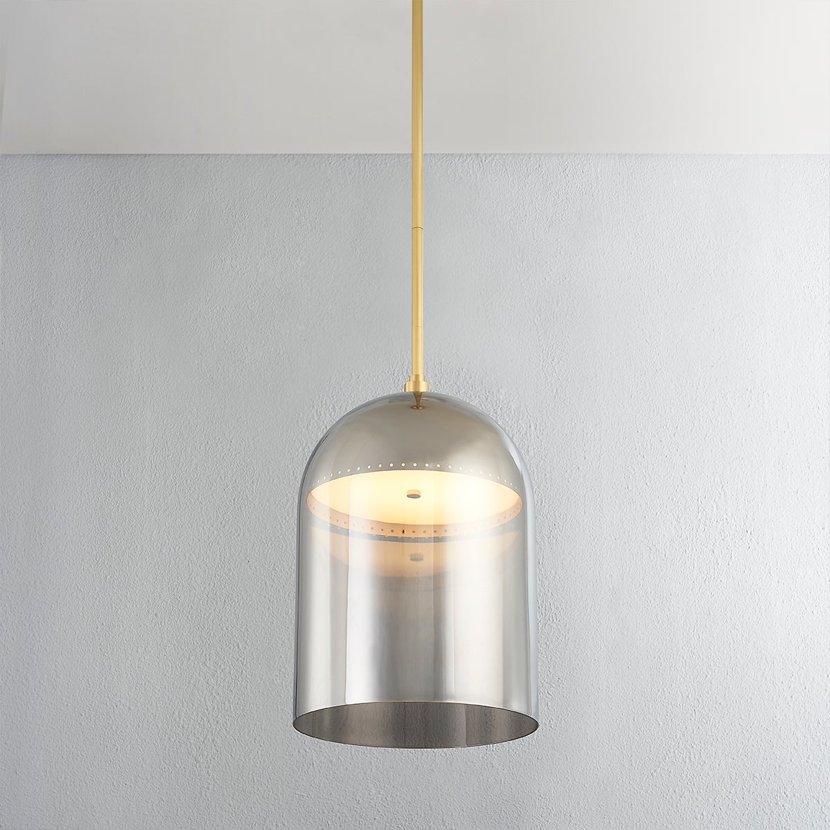 Dorval's modern layered design adds mystery and elegance. A smoked glass shade, suspended from an Aged Brass stem, covers a perforated metal dome. A diffuser softens the glow of the integrated LED light source and is beautifully finished with a matching brass finial.