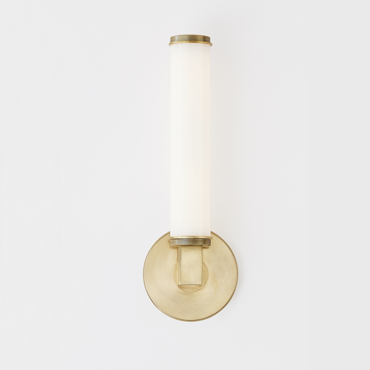 Add a dramatic effect to the bath or sophistication down a hallway with this modern one or two-light sconce that has timeless appeal. A recognizable sconce form feels fresh with detailed metalwork like the thick rectangular arm set against a round backplate and the knurled detailing on the ends of the opal glossy glass shades. Available in Aged Brass or Old Bronze.