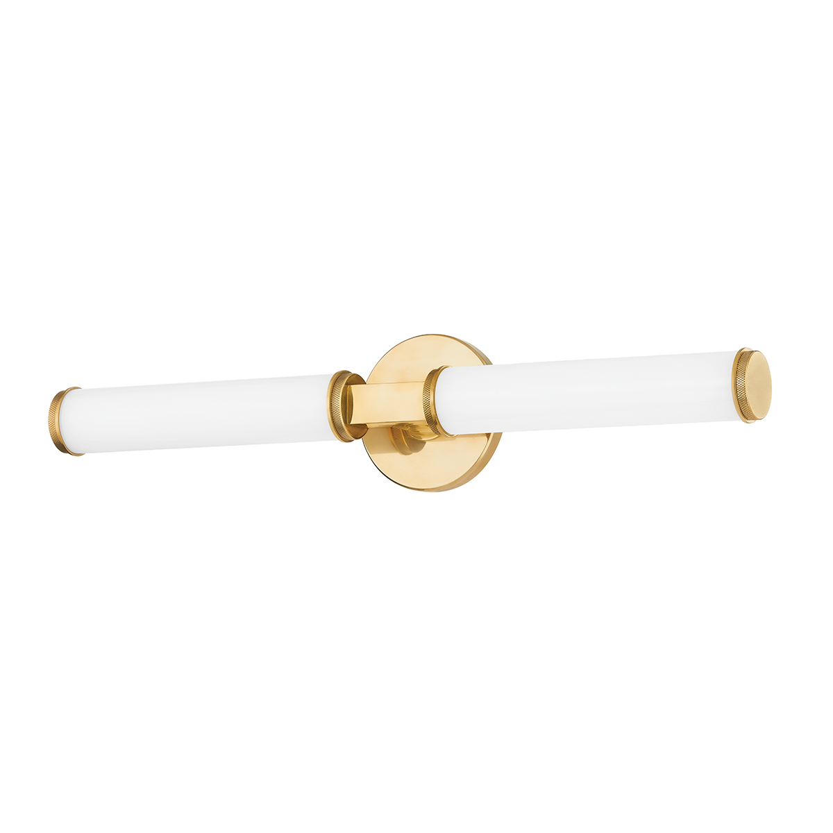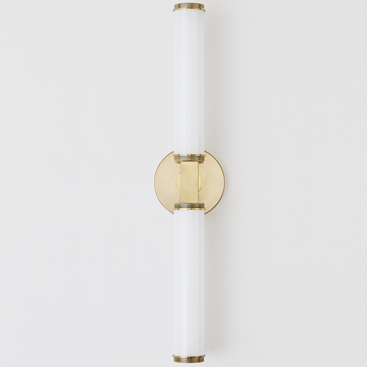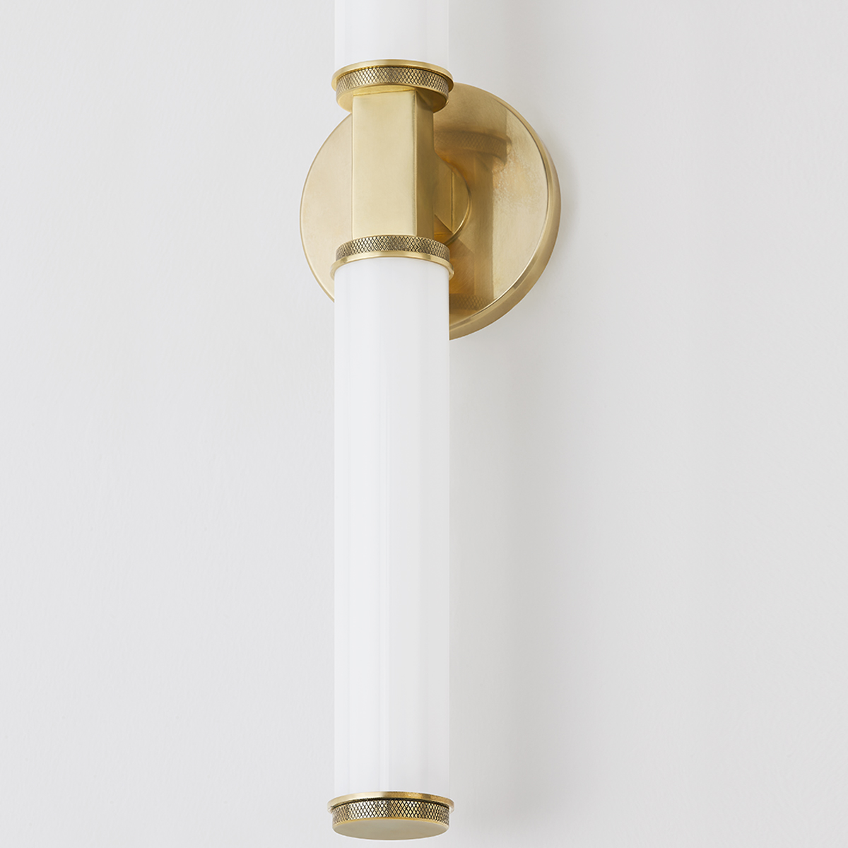 Add a dramatic effect to the bath or sophistication down a hallway with this modern one or two-light sconce that has timeless appeal. A recognizable sconce form feels fresh with detailed metalwork like the thick rectangular arm set against a round backplate and the knurled detailing on the ends of the opal glossy glass shades. Available in Aged Brass or Old Bronze.