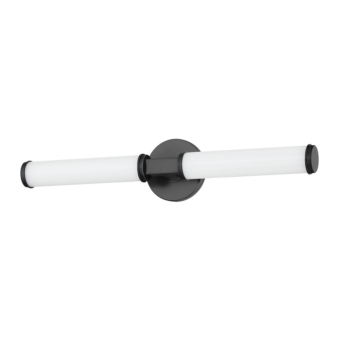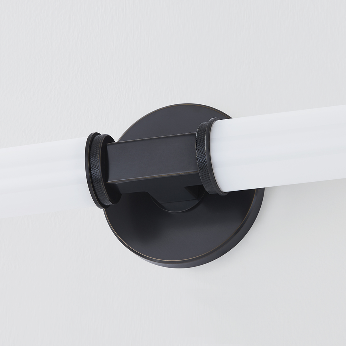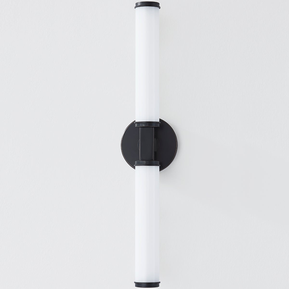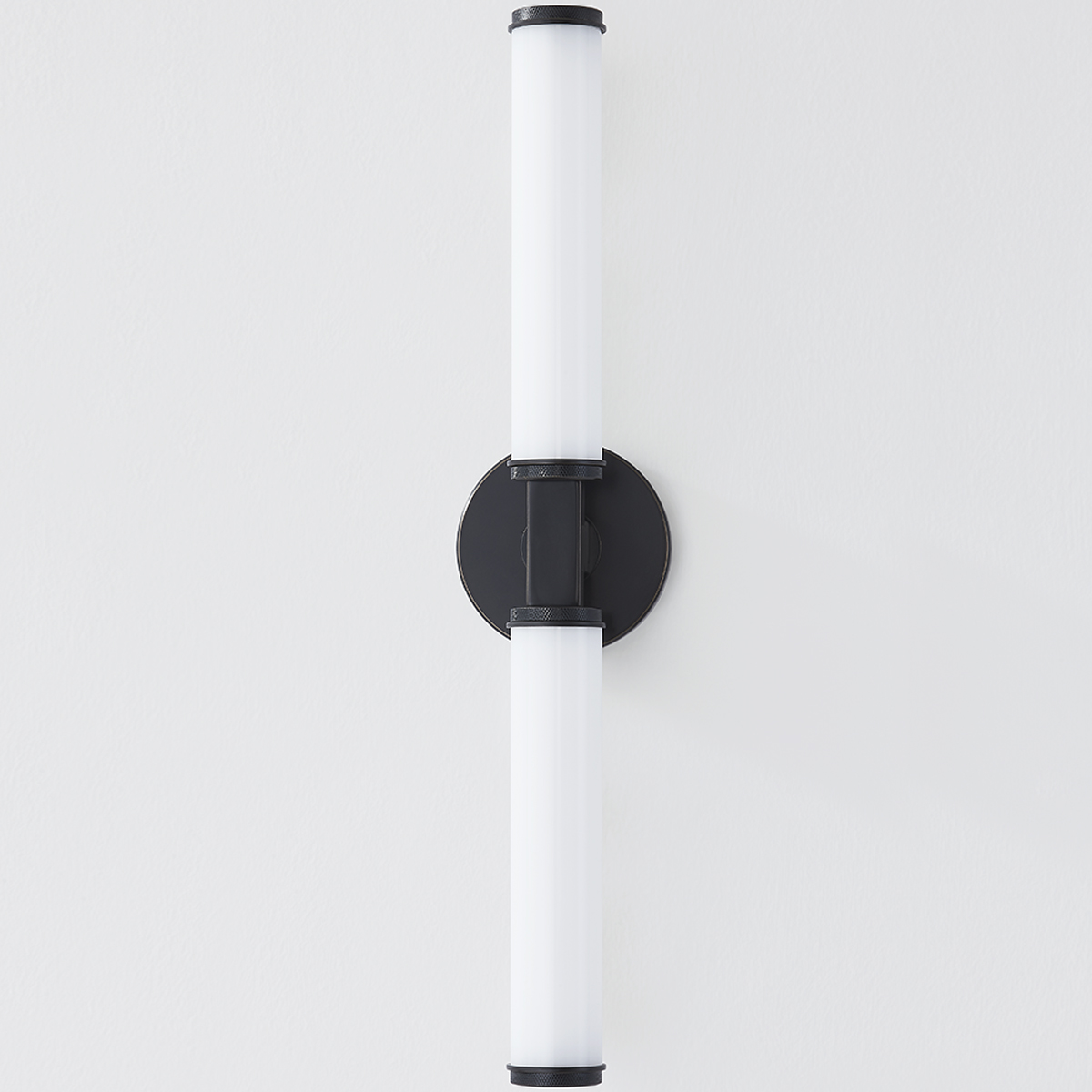 Add a dramatic effect to the bath or sophistication down a hallway with this modern one or two-light sconce that has timeless appeal. A recognizable sconce form feels fresh with detailed metalwork like the thick rectangular arm set against a round backplate and the knurled detailing on the ends of the opal glossy glass shades. Available in Aged Brass or Old Bronze.