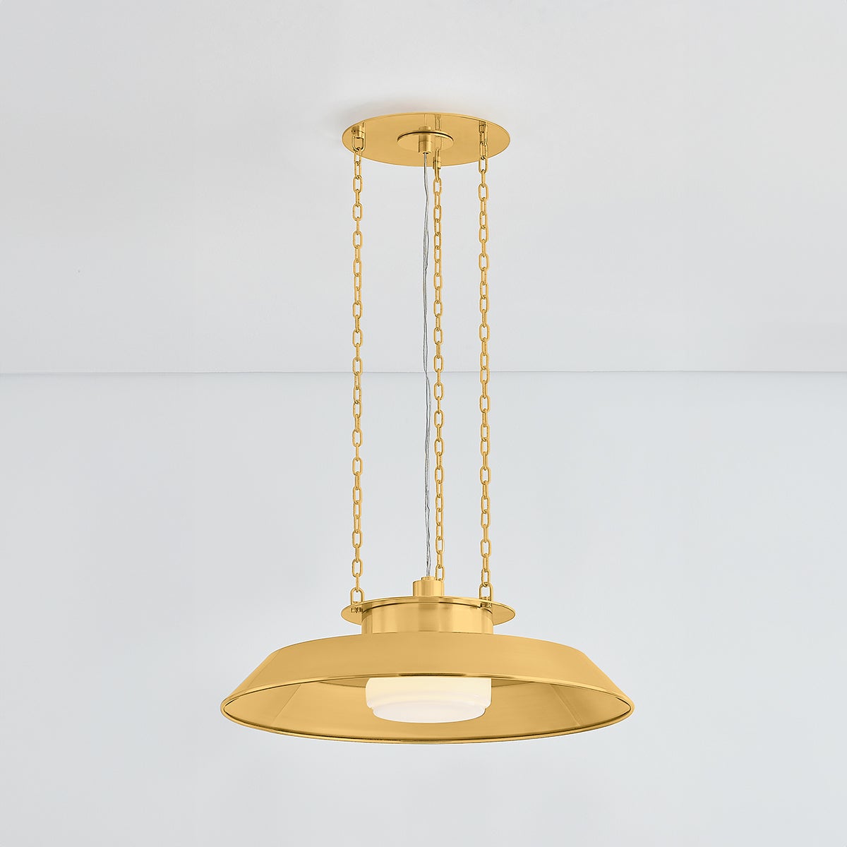 Taking cues from the innovative lamping techniques of bespoke maker brands, Woodrow features a classic RLM-style pendant silhouette. Beneath the large reflector, the opal shiny shade filters light both downwards and outwards. Three clean chains suspend this fixture, which is available in two sizes.
