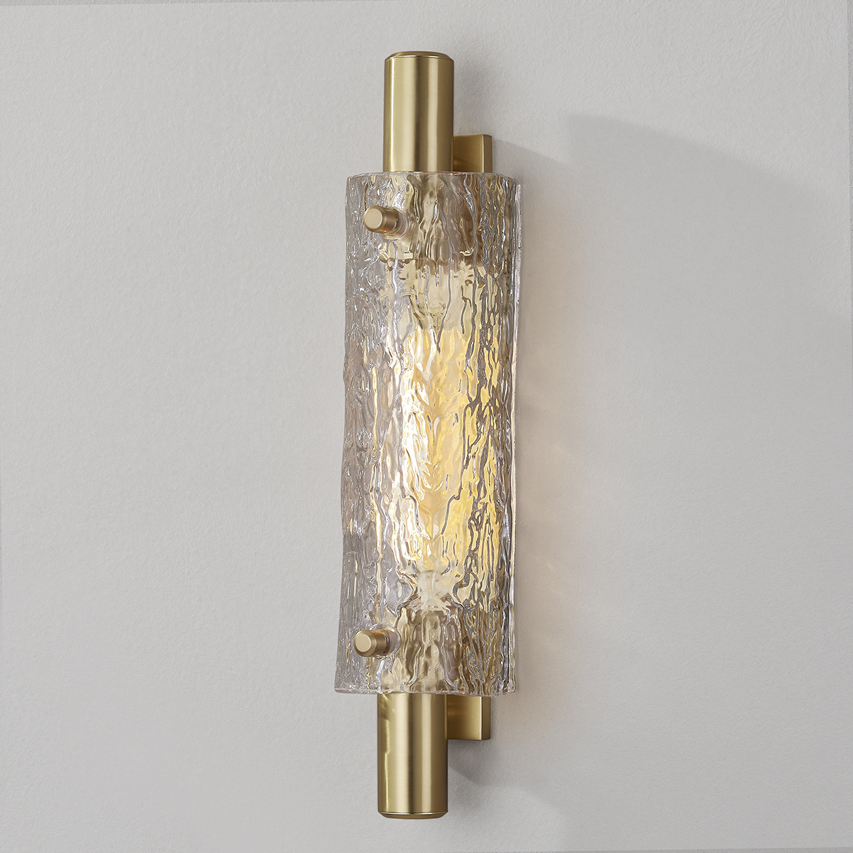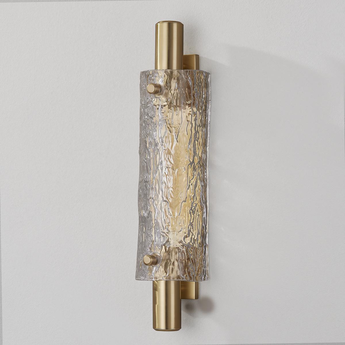 Clean lines and a familiar silhouette pair with unique materials and thoughtful details to give Harwich an elevated look. A curved piastra glass shade hugs a thick cylindrical metal frame and rectangular backplate. The stunning textured glass technique looks glamorous and gives this piece a luxurious quality. Harwich is available as a 1-light or 2-light sconce in two finishes and can be mounted horizontally or vertically.