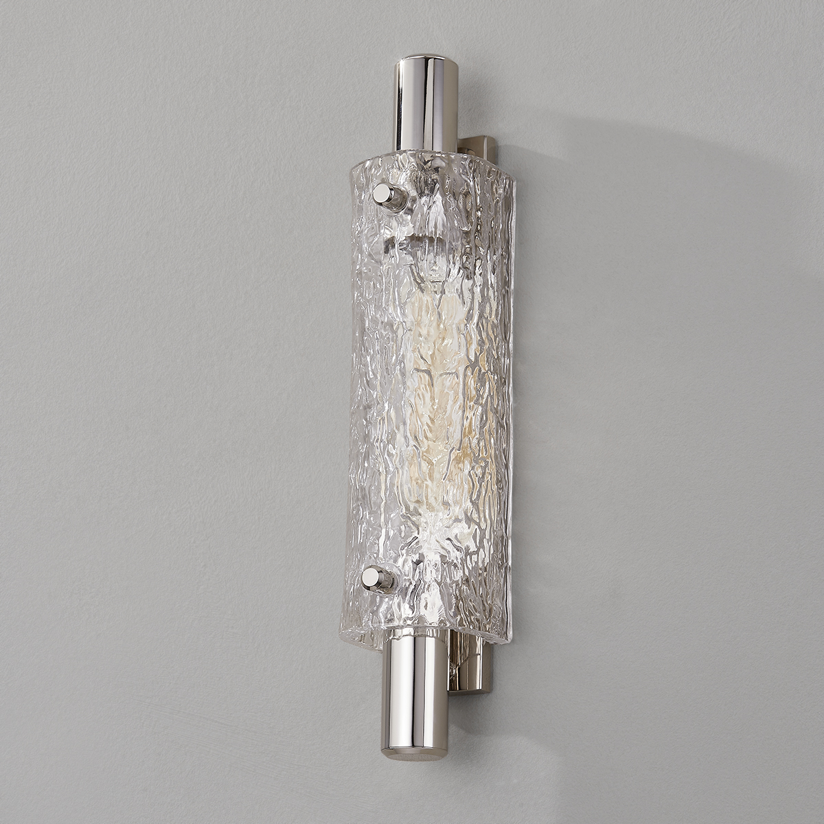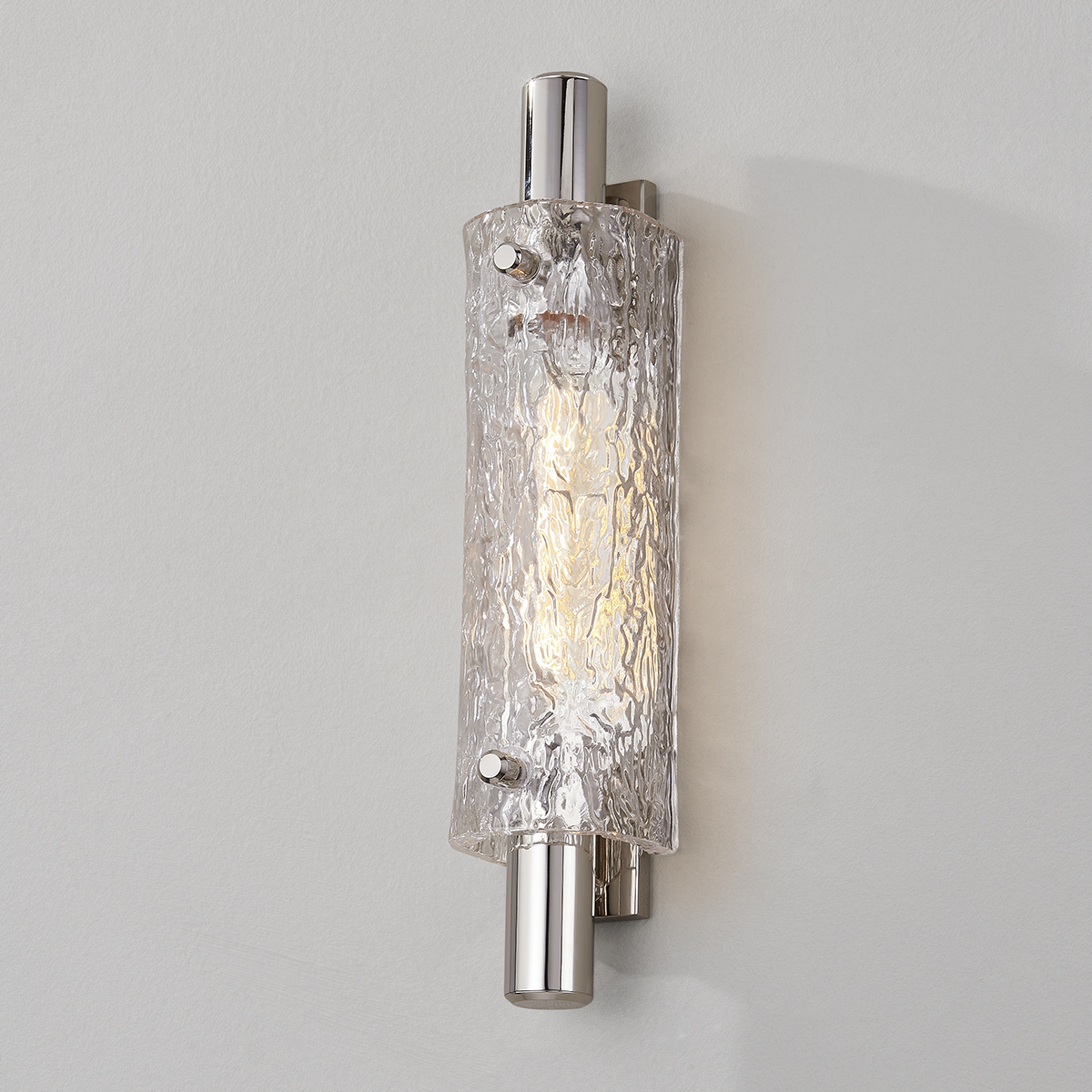 Clean lines and a familiar silhouette pair with unique materials and thoughtful details to give Harwich an elevated look. A curved piastra glass shade hugs a thick cylindrical metal frame and rectangular backplate. The stunning textured glass technique looks glamorous and gives this piece a luxurious quality. Harwich is available as a 1-light or 2-light sconce in two finishes and can be mounted horizontally or vertically.