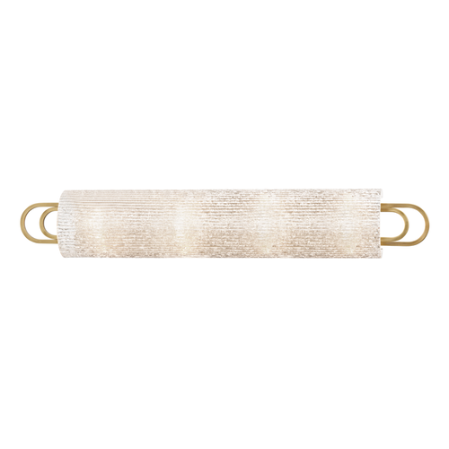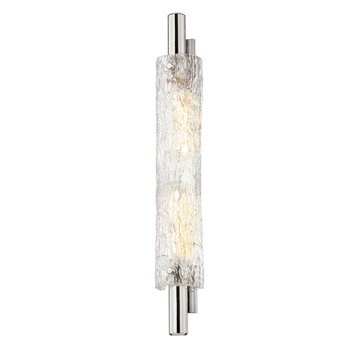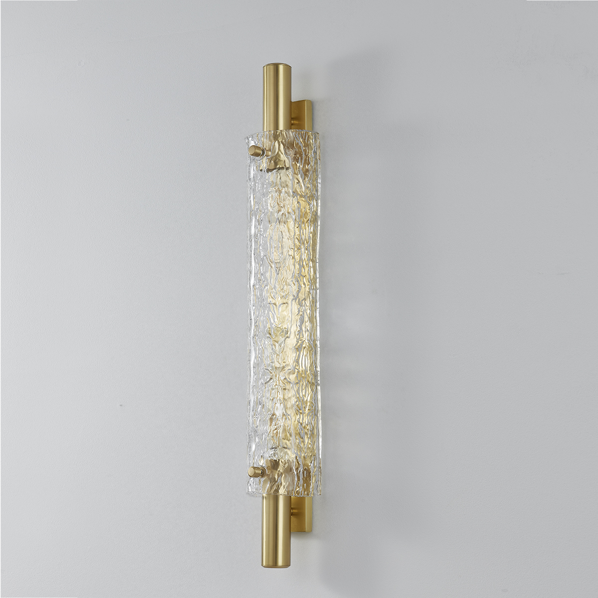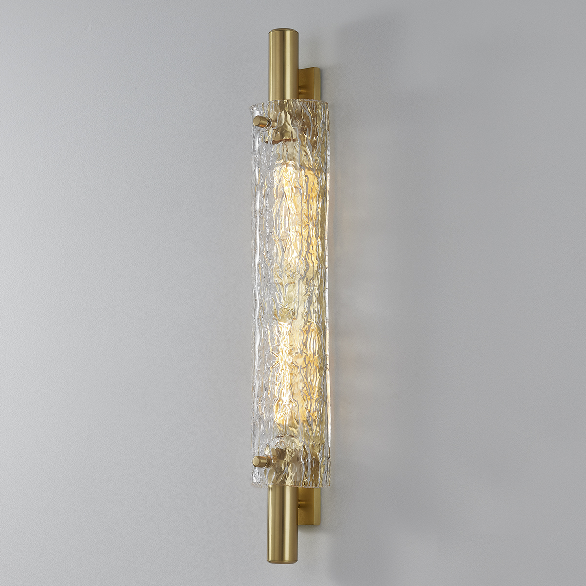 Clean lines and a familiar silhouette pair with unique materials and thoughtful details to give Harwich an elevated look. A curved piastra glass shade hugs a thick cylindrical metal frame and rectangular backplate. The stunning textured glass technique looks glamorous and gives this piece a luxurious quality. Harwich is available as a 1-light or 2-light sconce in two finishes and can be mounted horizontally or vertically.